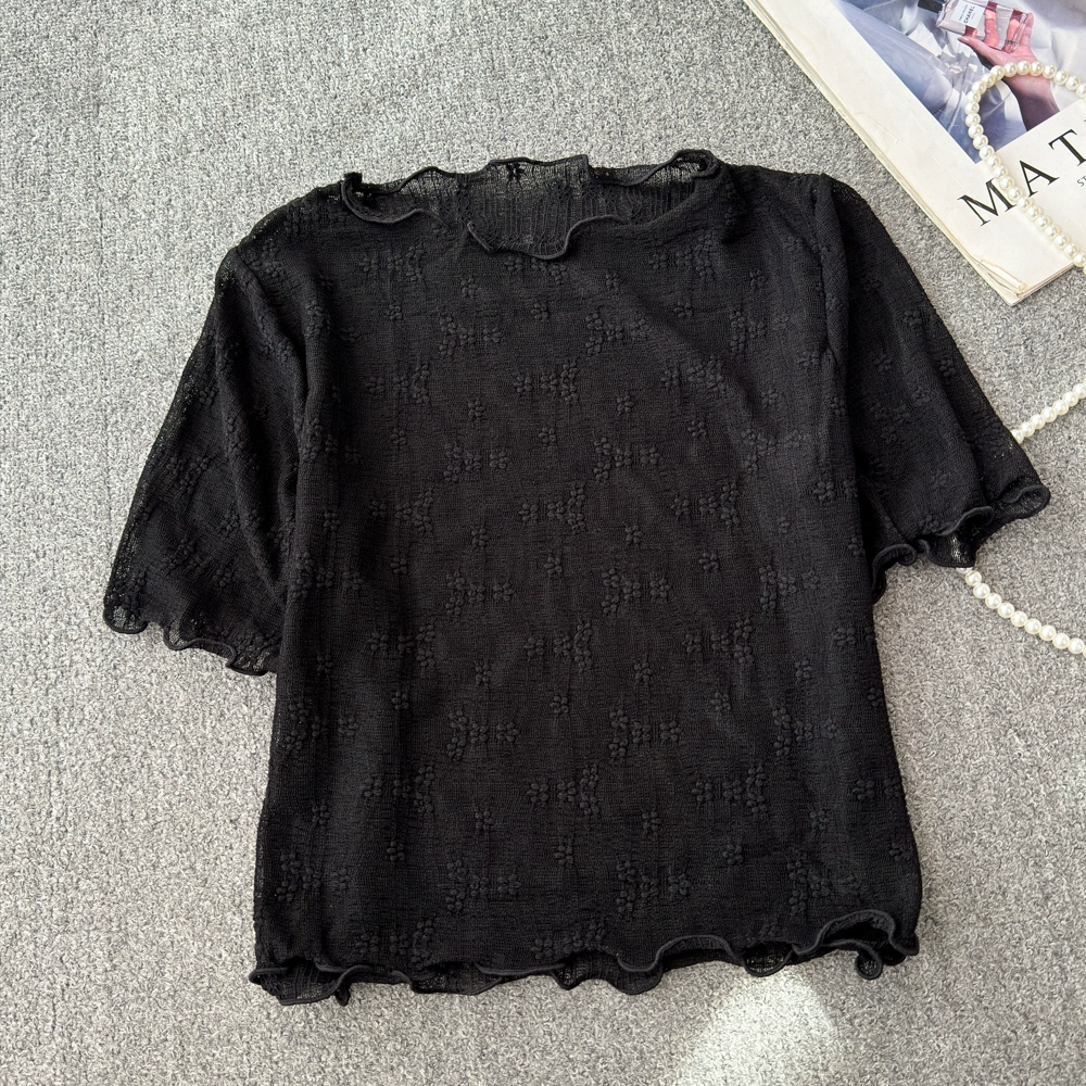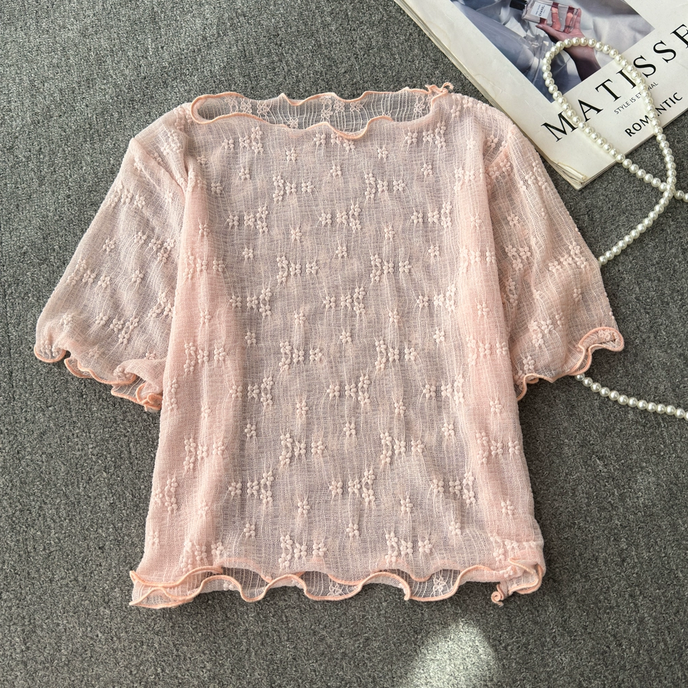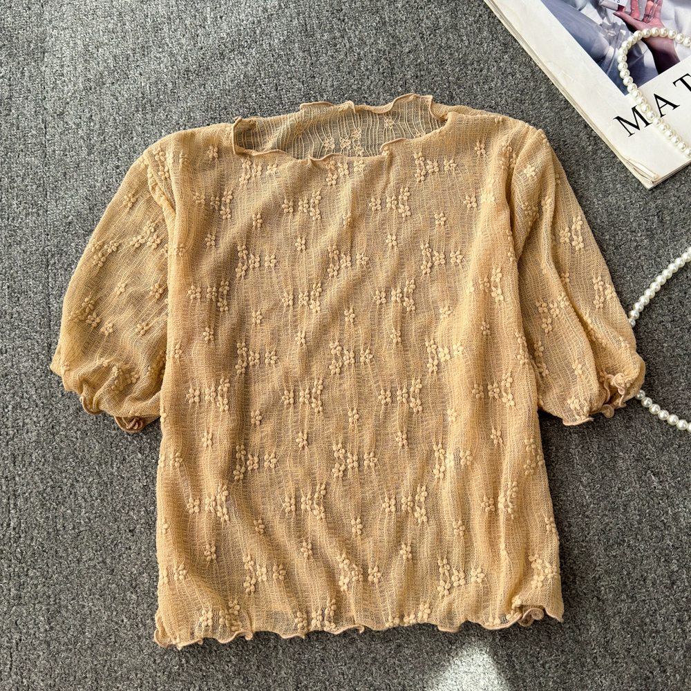 Sweet hook pattern hollow lace puff sleeve lace shirt for women summer gentle wind layering top versatile see-through blouse