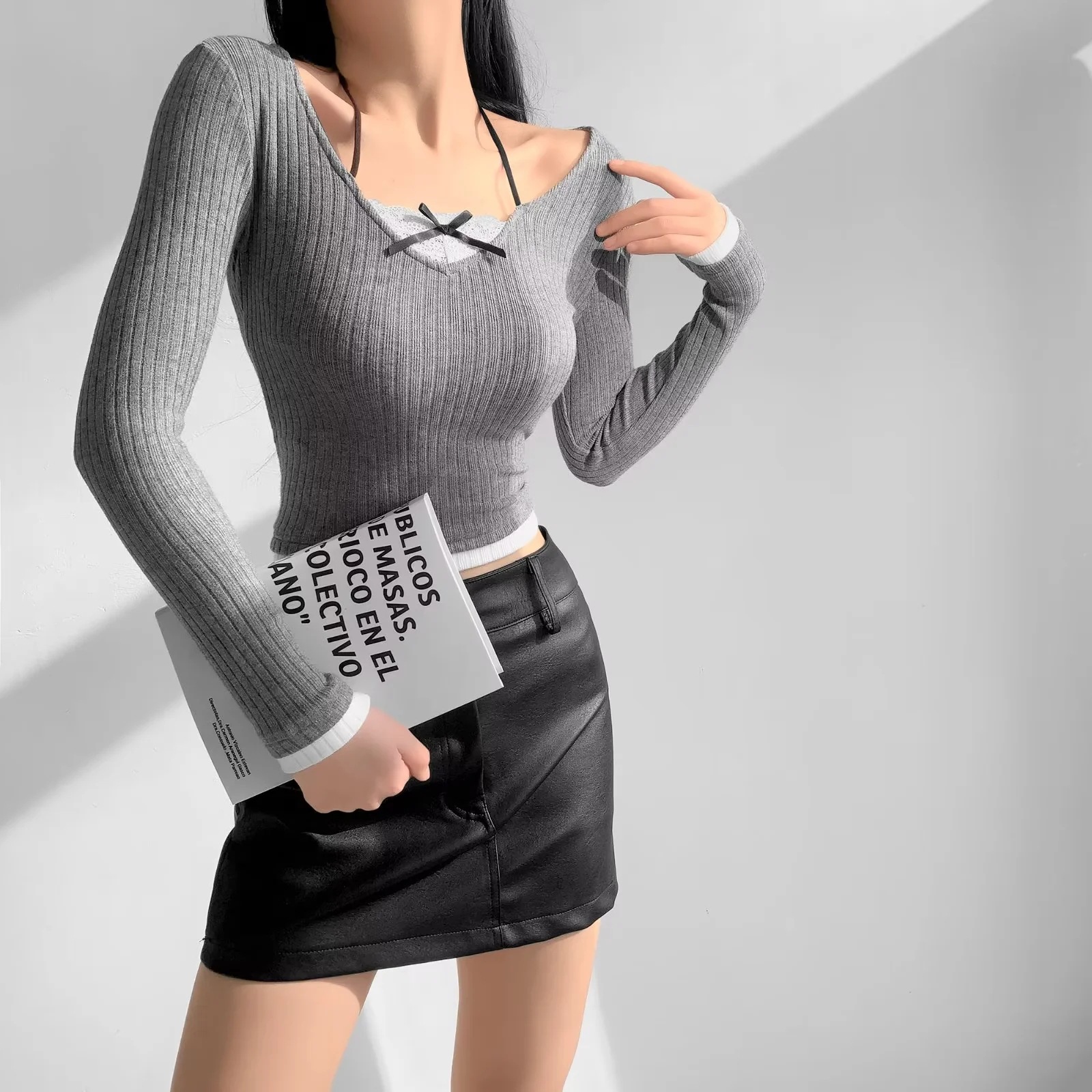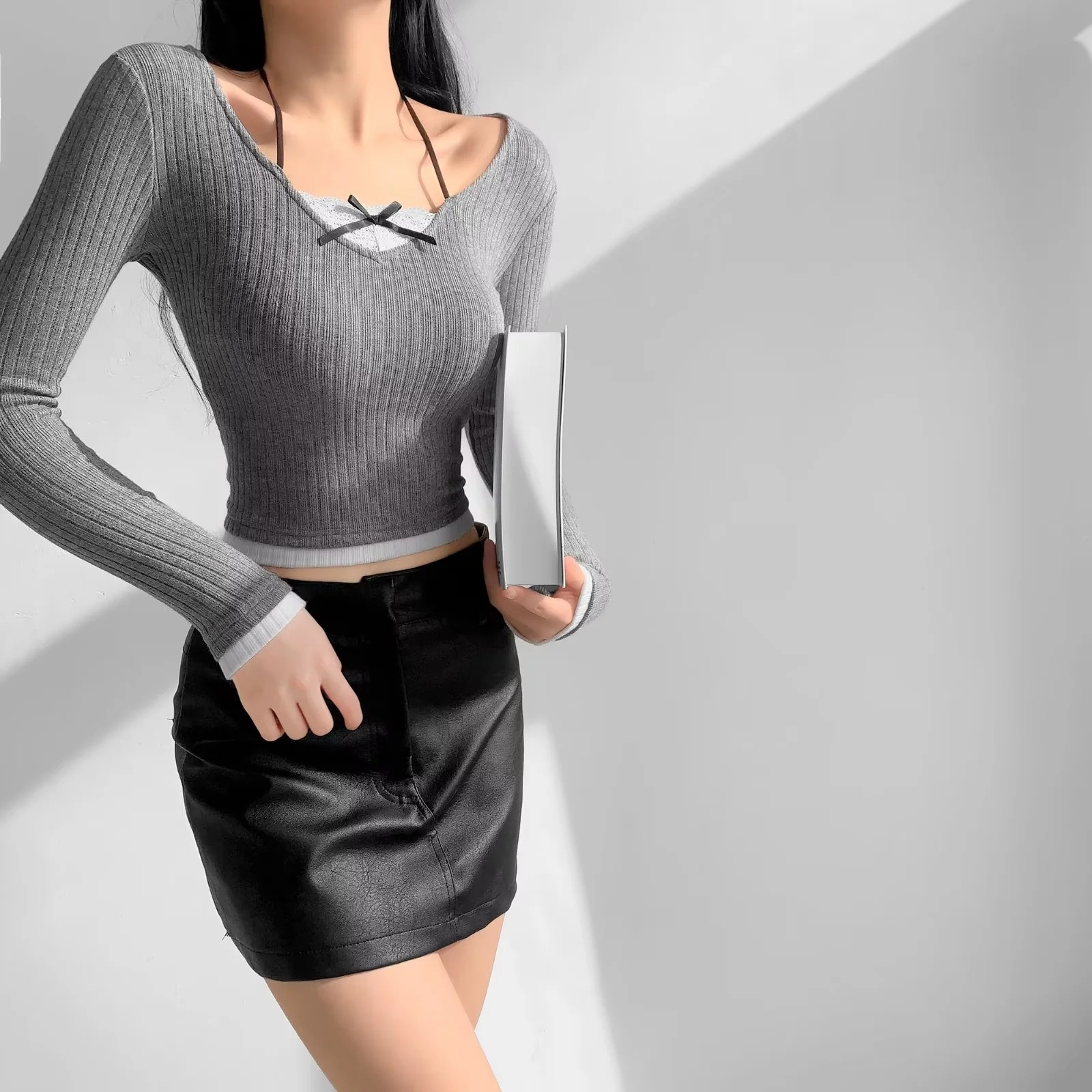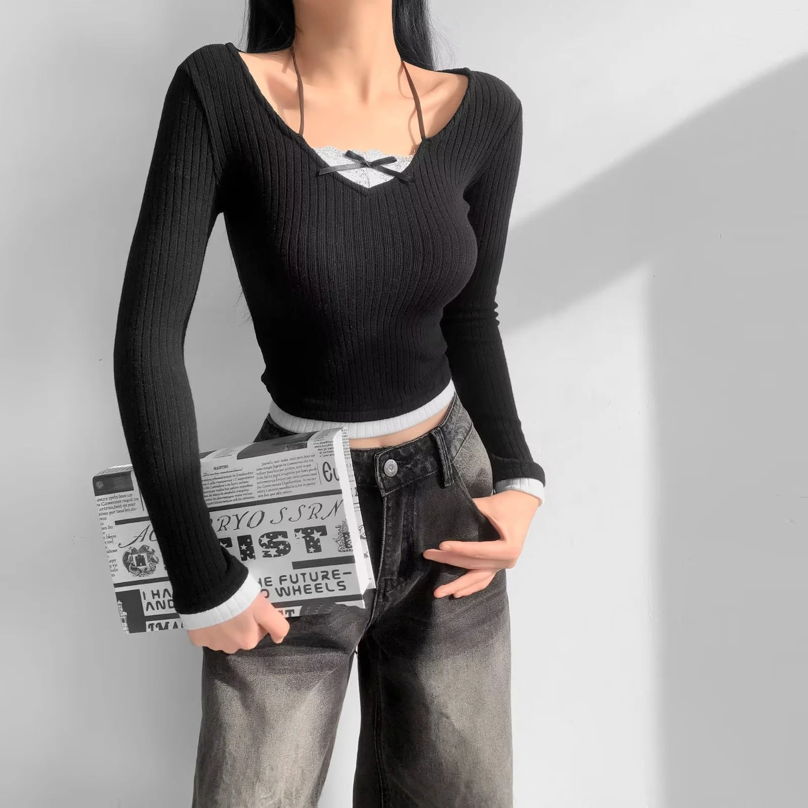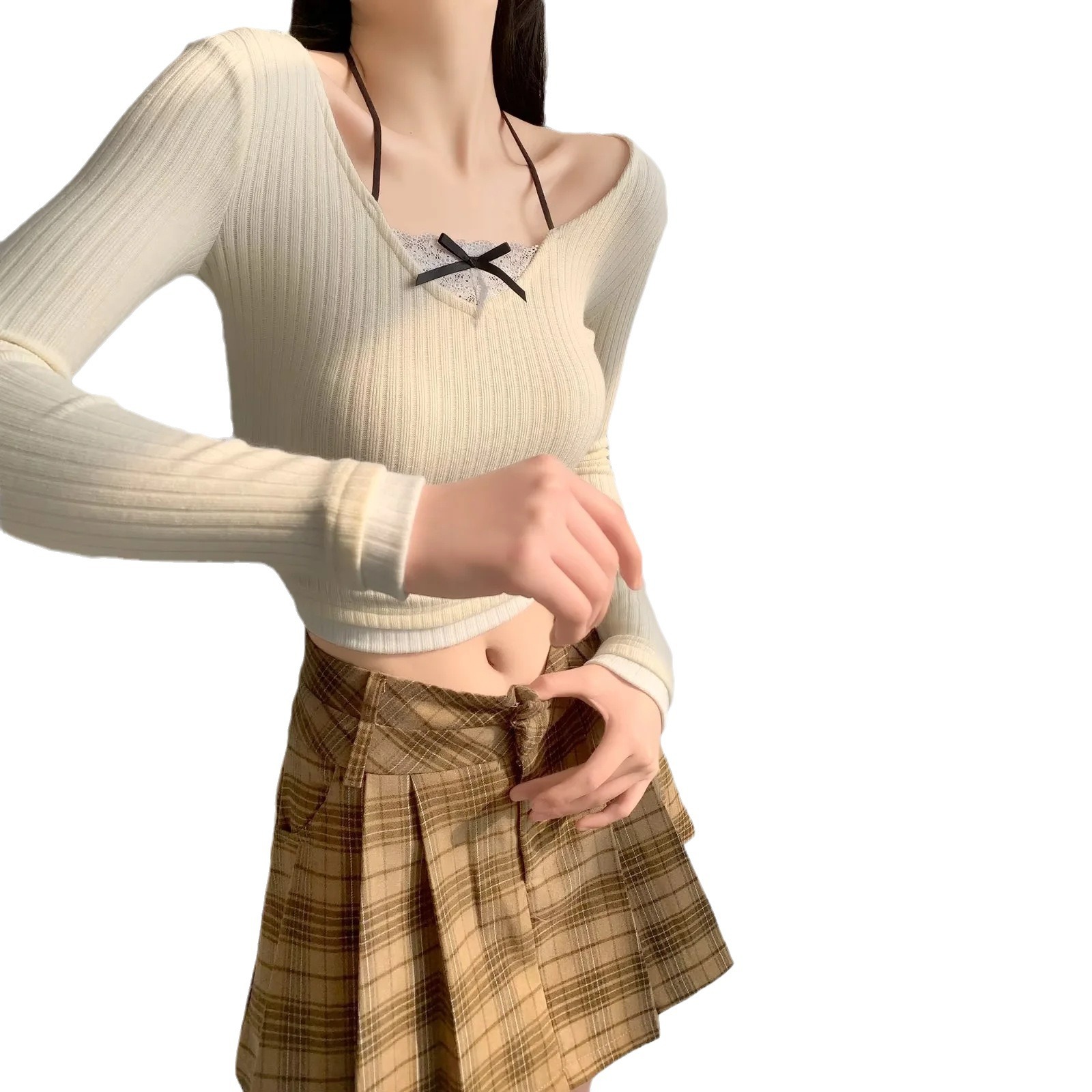 | nameOriginal | Sweet Lovely Girl Lace Sling Fake Two-piece Long-sleeved Base Shirt with Hanging Neck Contrast Hot Girl's Stretch Slim-fit Top |