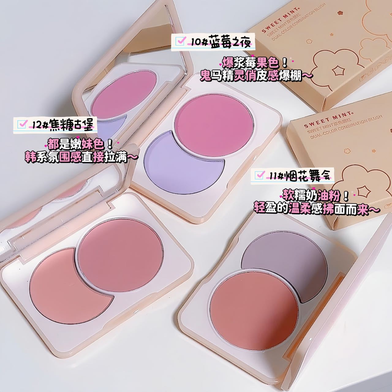 | nameOriginal | Sweet Mint Two-color Blush Matte Natural Repairer Rouge Sun Red Natural Delicate Repairer Gills Blue Gills Purple |