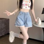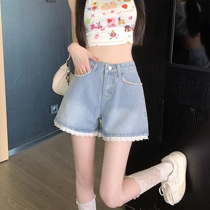| nameOriginal | Sweet Spice Girl High Waist Slimming Denim Shorts Women's Summer New Petite Beaded Lace Wide Leg A- shaped Hot Pants |