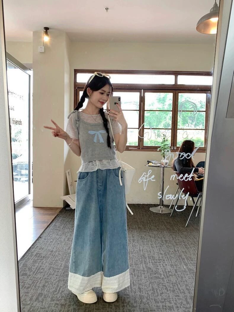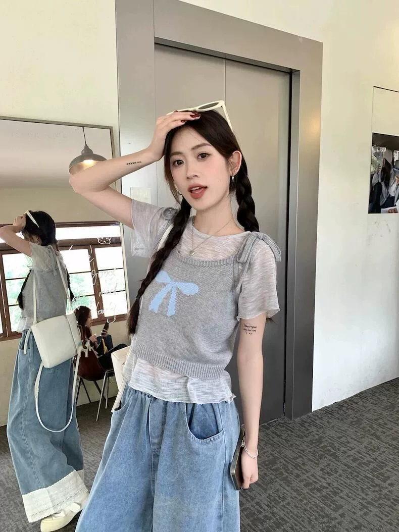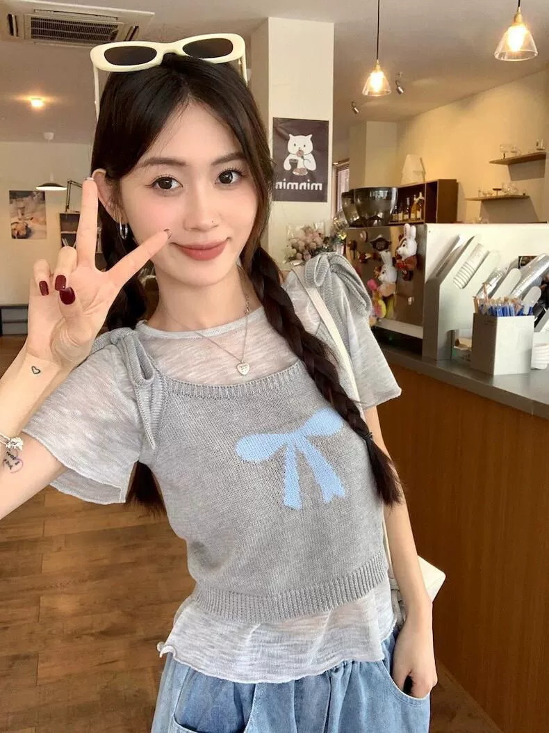 | nameOriginal | Sweet strappy mesh knitted layered T-shirt with bow |
