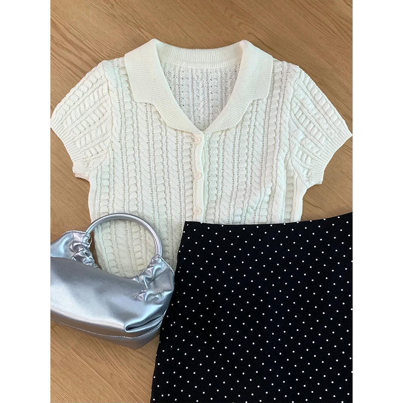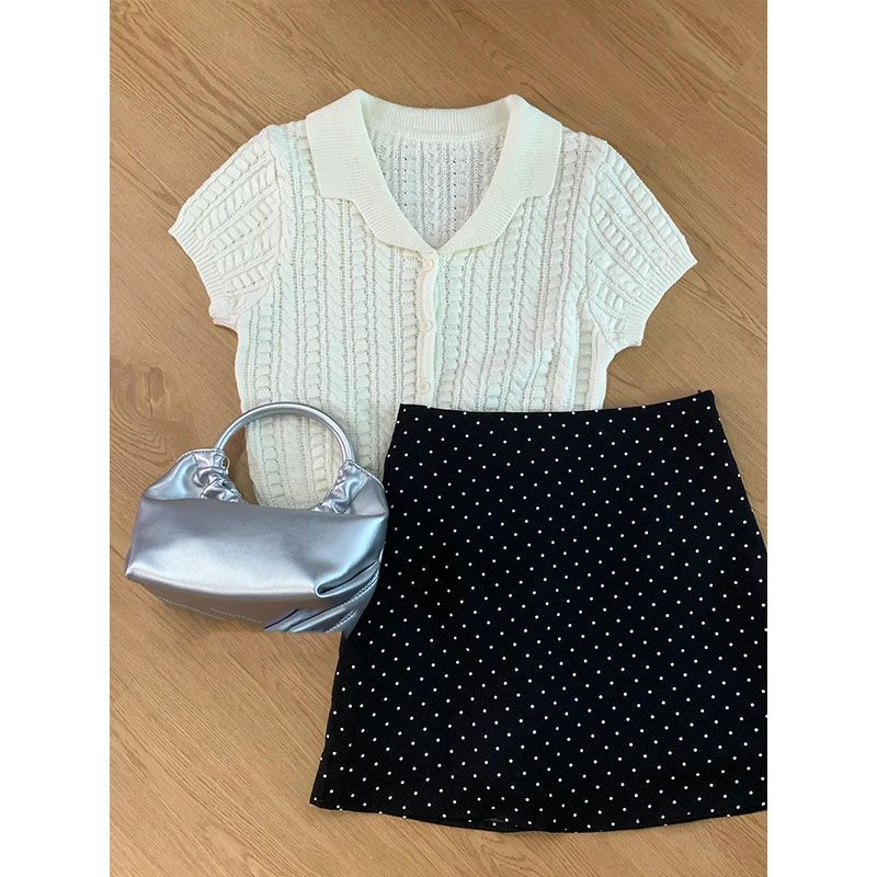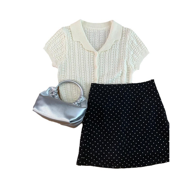| nameOriginal | Sweet Style Korean Style Knitted Hollow-out Short-sleeved Top suit Women's Summer New High Waist Slimming Polo Dot Skirt |