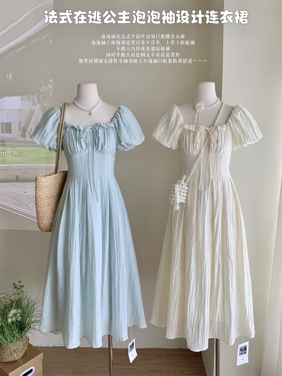 Square collar tied puff sleeve sweet waist-hugging dress