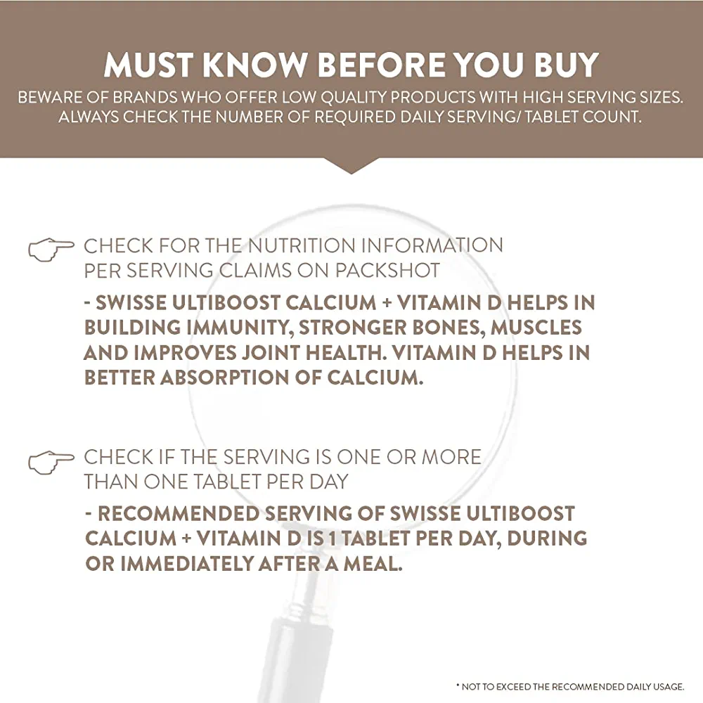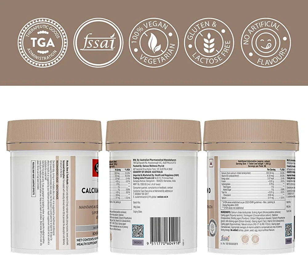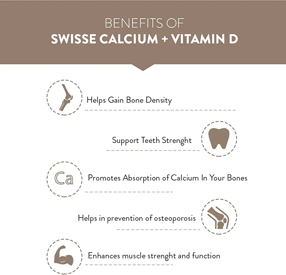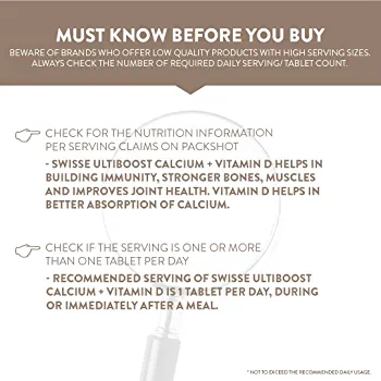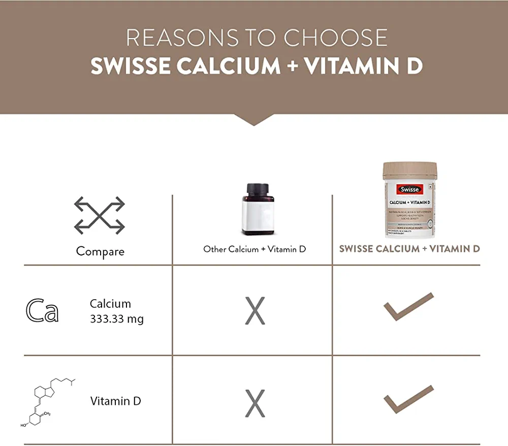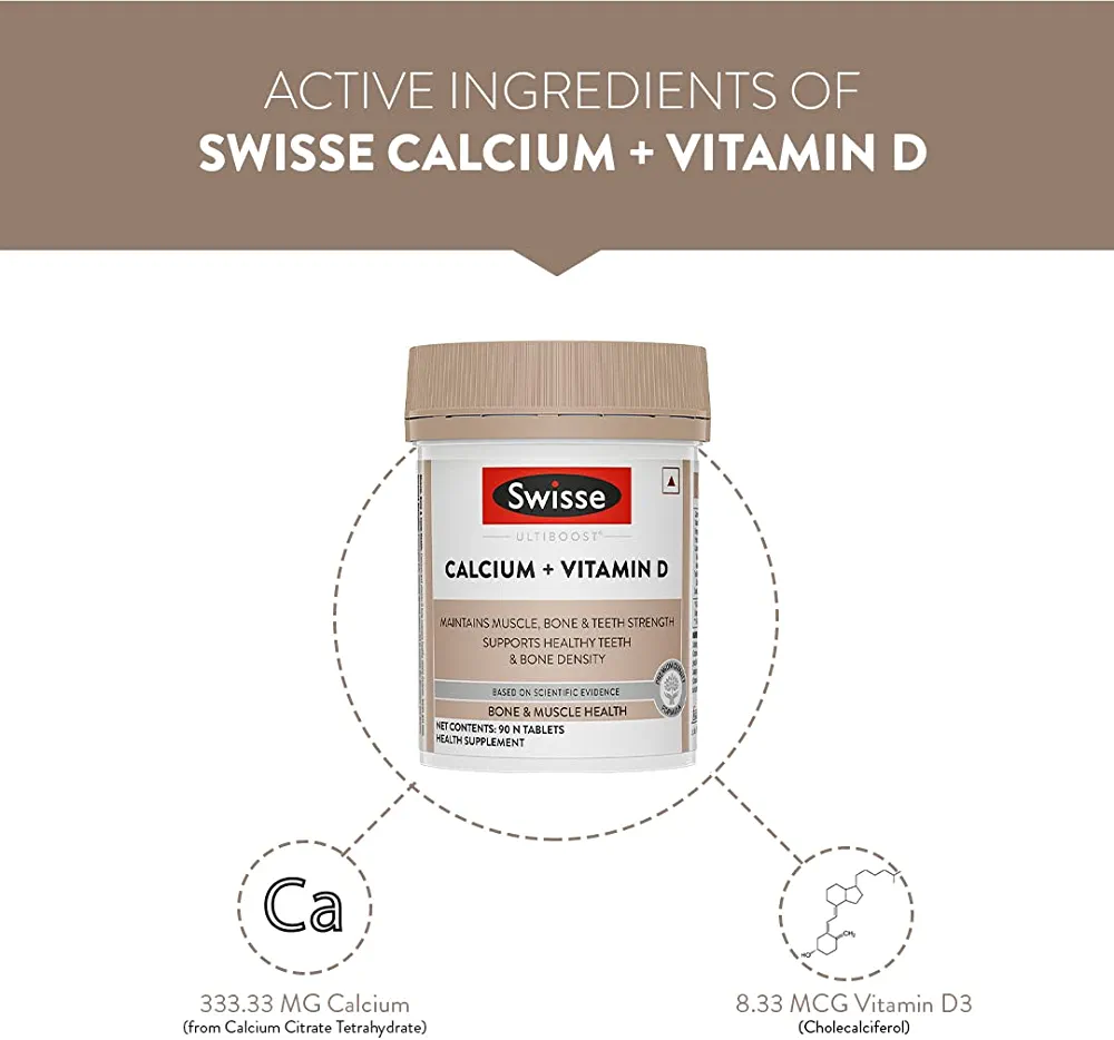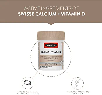 Swisse Ultiboost Calcium + Vitamin D helps in improving bone density and supporting teeth strength. It contains calcium and vitamin D as key ingredients.