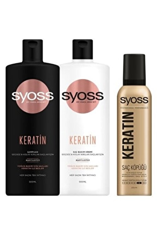 Syoss Keratin Excellence Shampoo Syoss’s powerful formulas give hair strength and healthy appearance thanks to AMINO COMPLEX, which consists of natural ingredients and amino acids native to Asia. Keratin: It helps restore keratin structure in hair cells by intensive care with its formula containing Blue Lotus. Syoss Keratin Excellence Conditioner 500 Ml Syoss’s powerful formulas provide strength and healthy appearance to hair thanks to AMINO COMPLEX, which consists of natural ingredients and amino acids native to Asia. Keratin: It helps restore keratin structure in hair cells by intensive care with its formula containing Blue Lotus. Syoss Keratin Hair Foam with keratin components in it strengthens the hair and provides a radiant look on the hair. It maintains your hairstyle with an extra strong grip for 48 hours. Grip level: 4