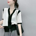 T Counter Shopping Mall Withdraws First-Line Export Cut Label Tail Sheet Women’s V-Neck Black and White Stitching Zipper Short Sleeve Knitted Open