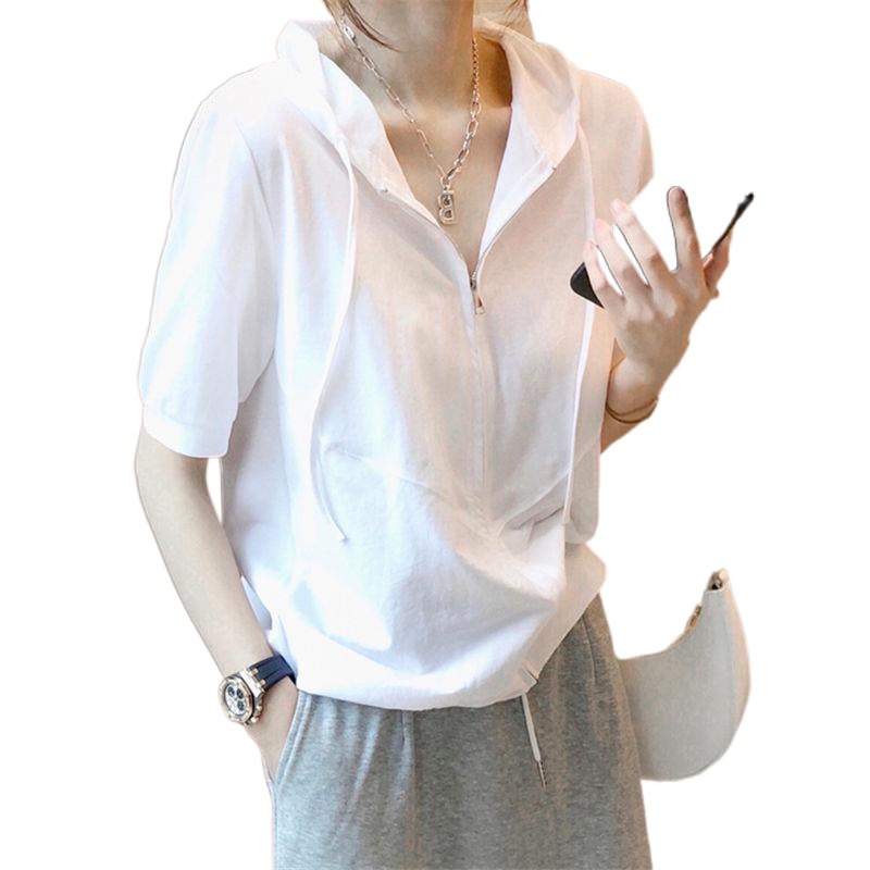 T counter shopping mall withdraws first-line export cut-off single tail single women's white zipper hooded short sleeve T-shirt