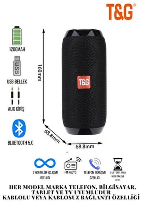 TG117 Bluetooth speaker portable wireless speaker audio system 3D Stereo music in Surround soundbar TF /AUX /USB Input High sound Extra Bass Description: 1. 2 Speakers Pairing Feature Brand new and high quality. 2. mesh cover to protect the speaker from water, dust, shock. 3. IPX5 waterproof, dustproof, shockproof. 4. 5W with two bass apertures on all sides * 2 big power, vibrate when playing music. 5. Cylindrical shape and built-in left and right channel offer 360° stereo. 6. wireless working distance is up to 10 meters. 7. FM receiver allows you to listen to radio freely 8. Support MP3, WMA, WAV, FLAC, APE format music files. 9. Support TF card or misro SD card up to 32G, support USB 2.0 Disk. 10. support USB memory disk plug and play. 11. Support external MP3 /MP4/computer and other audio input function (AUX) 12. Easy button control, on/off, play/pause, switch mode, toss songs 13. Bluetooth 5.0, fast connection and stable signal, compatible with all Bluetooth devices. 14. 2/3 mAh battery for up to 6 hours playtime at 1200 volume with full charge. 15. Only one bluetooth speaker Not only a radio, a wireless speaker, a bass boom box Feature: Support A2DP, AVRCP, Handsfree profile, FM radio Bluetooth version: V4.2 Working range: 10meters Size: 160mm*68mm*68mm Gross weight: 420g Speaker: 45mm Speaker output: 10W Signal-noise:? 95dB Distortion:? 0.5% Battery voltage/capacity: 1200mAh Battery charge voltage: 5V±0.5V Battery charging time: 2-3hours Playback time values for speakers: 4-5hours Package list: T&G117 Bluetooth speaker x1