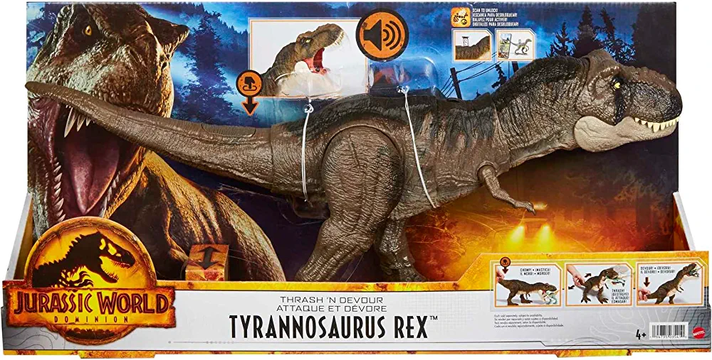 | nameOriginal | Jurassic World Dominion Dinosaur T Rex Toy, Thrash ‘N Devour Tyrannosaurus Rex Action Figure with Sound and Motion, HDY56 |