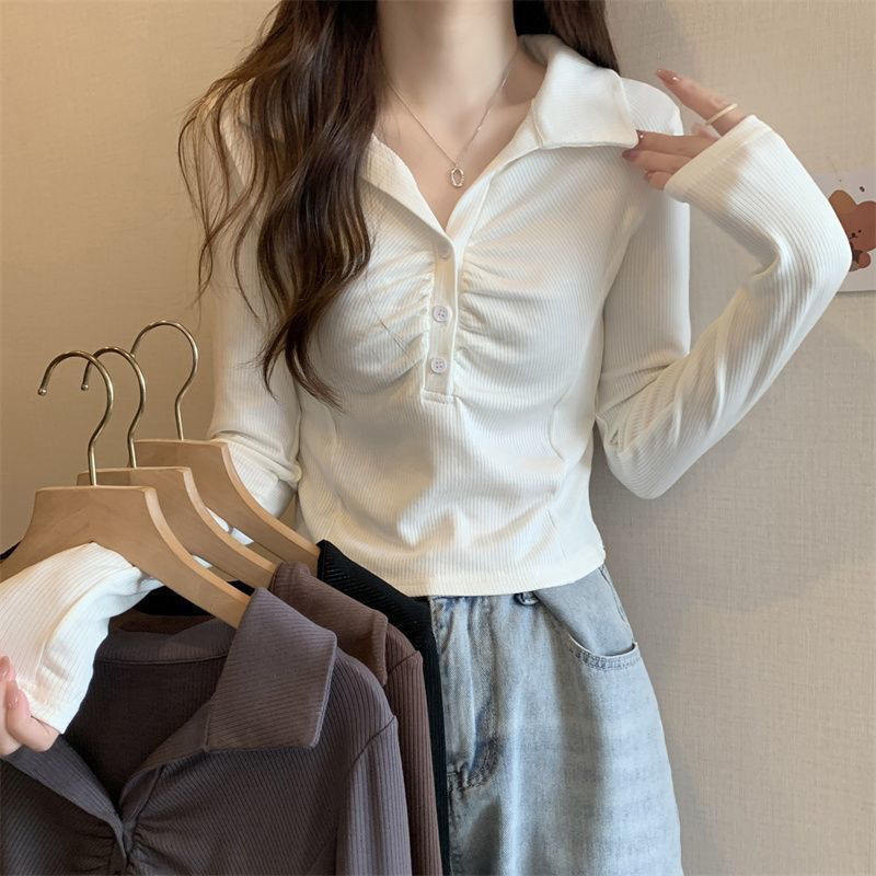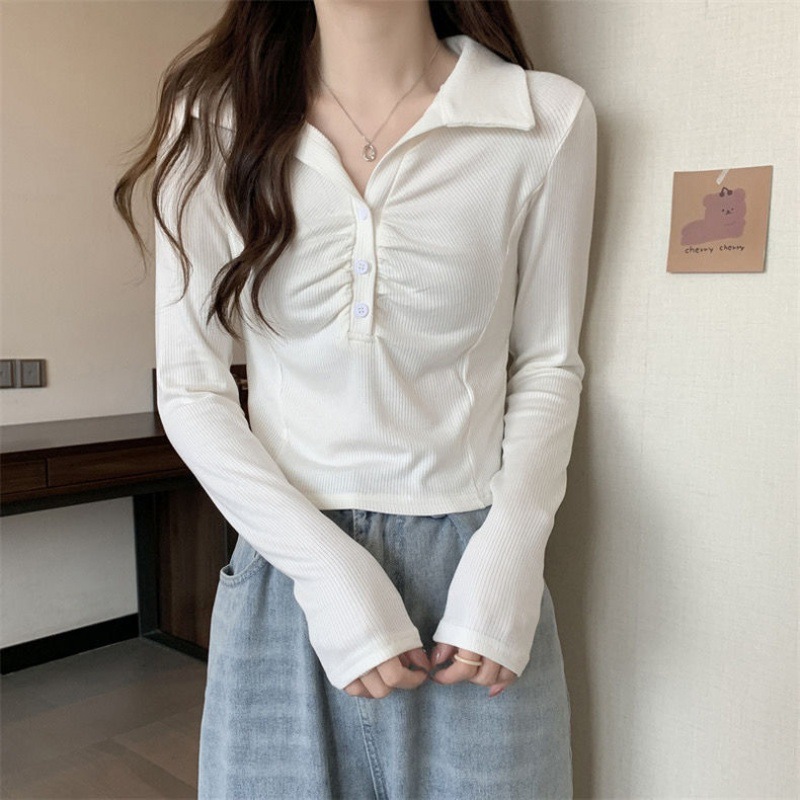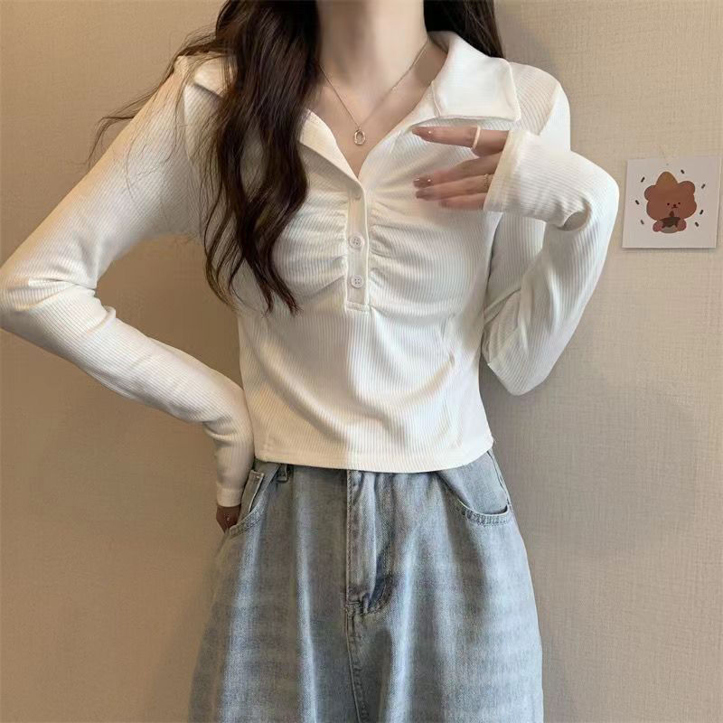 T-shirt Base Shirt Women’s Spring and Autumn Design Sense Niche Elegant Pleated Slim Sweet Unique Chic Small Shoulder Top