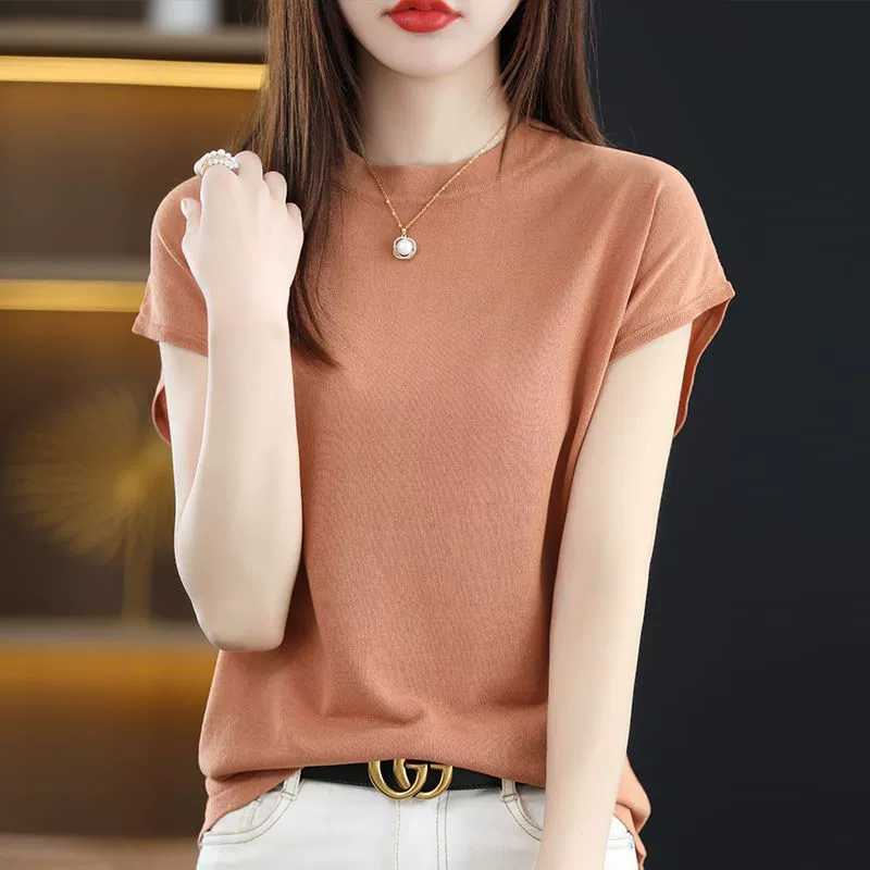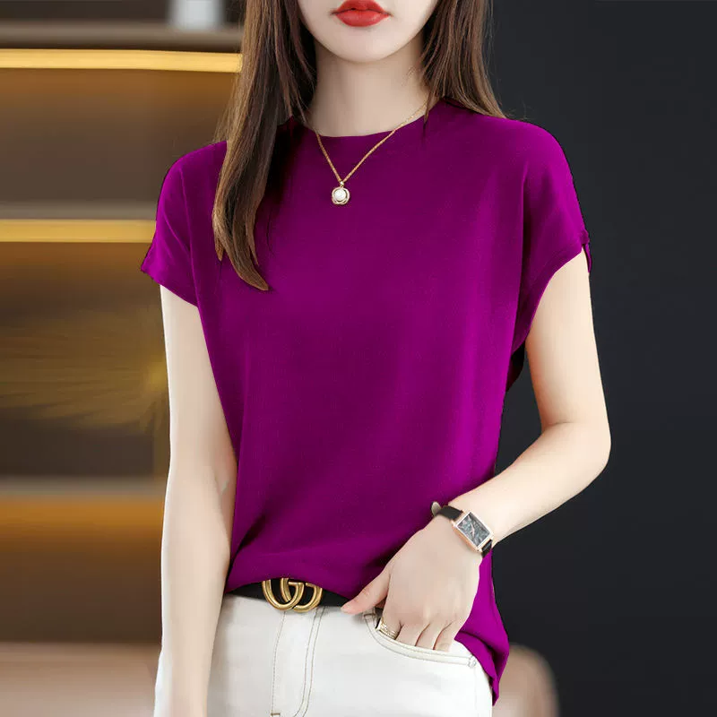 T-shirt half turtleneck top ice silk thin knitted short sleeves