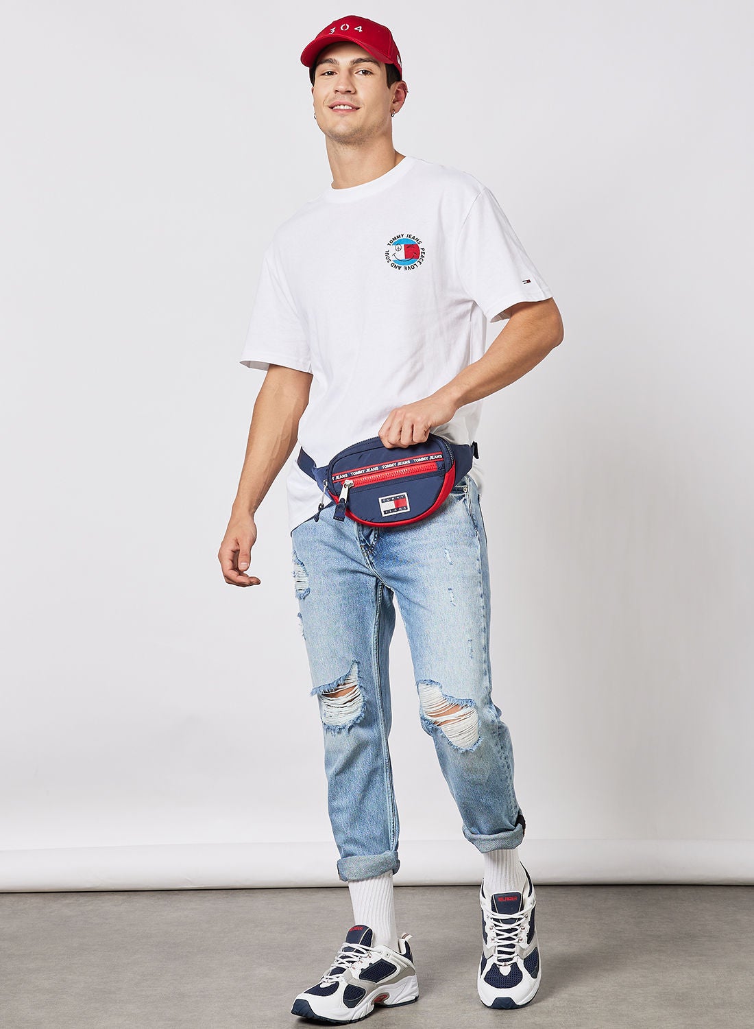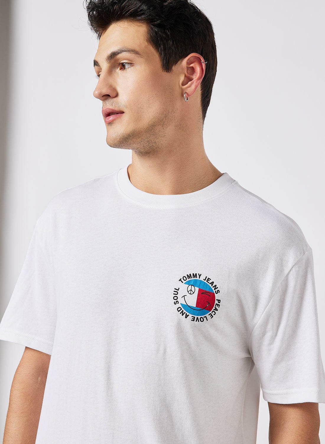 This product features a blend of organic cotton that is stretchable, and has been sourced through the Better Cotton Initiative. It has a crew neck and short sleeves, and should be washed according to the care label instructions. The Tommy Jeans signature branding detail adds a stylish touch. The model is approximately 184 cm tall and is wearing a size M.