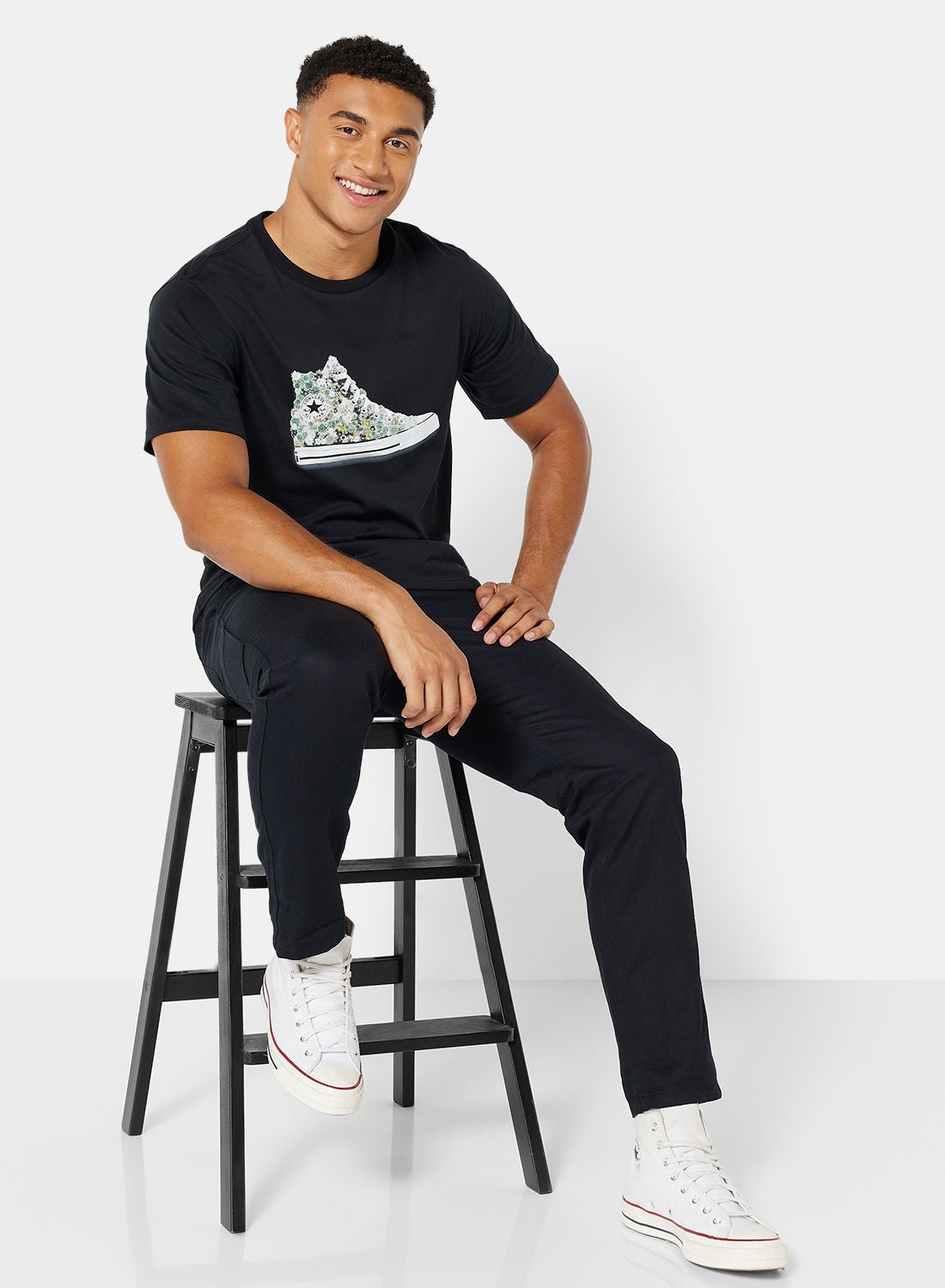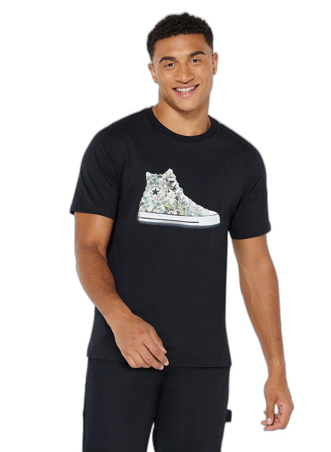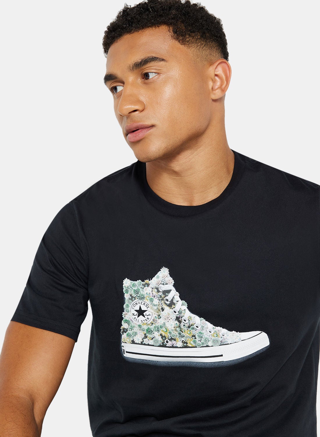 This product features a comfortable and airy cotton material, adorned with charming floral sneaker designs on the chest. It has a classic crew neckline, short sleeves, and should be washed as per the care label instructions. The model pictured is around 183cm tall and is wearing a size M. Additionally, the product includes Converse’s signature branding detail.
