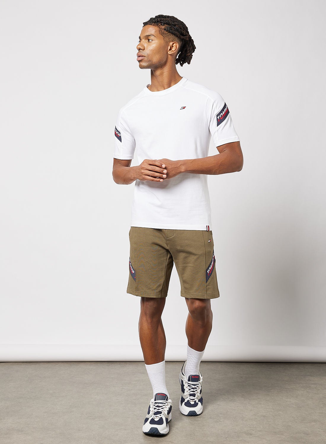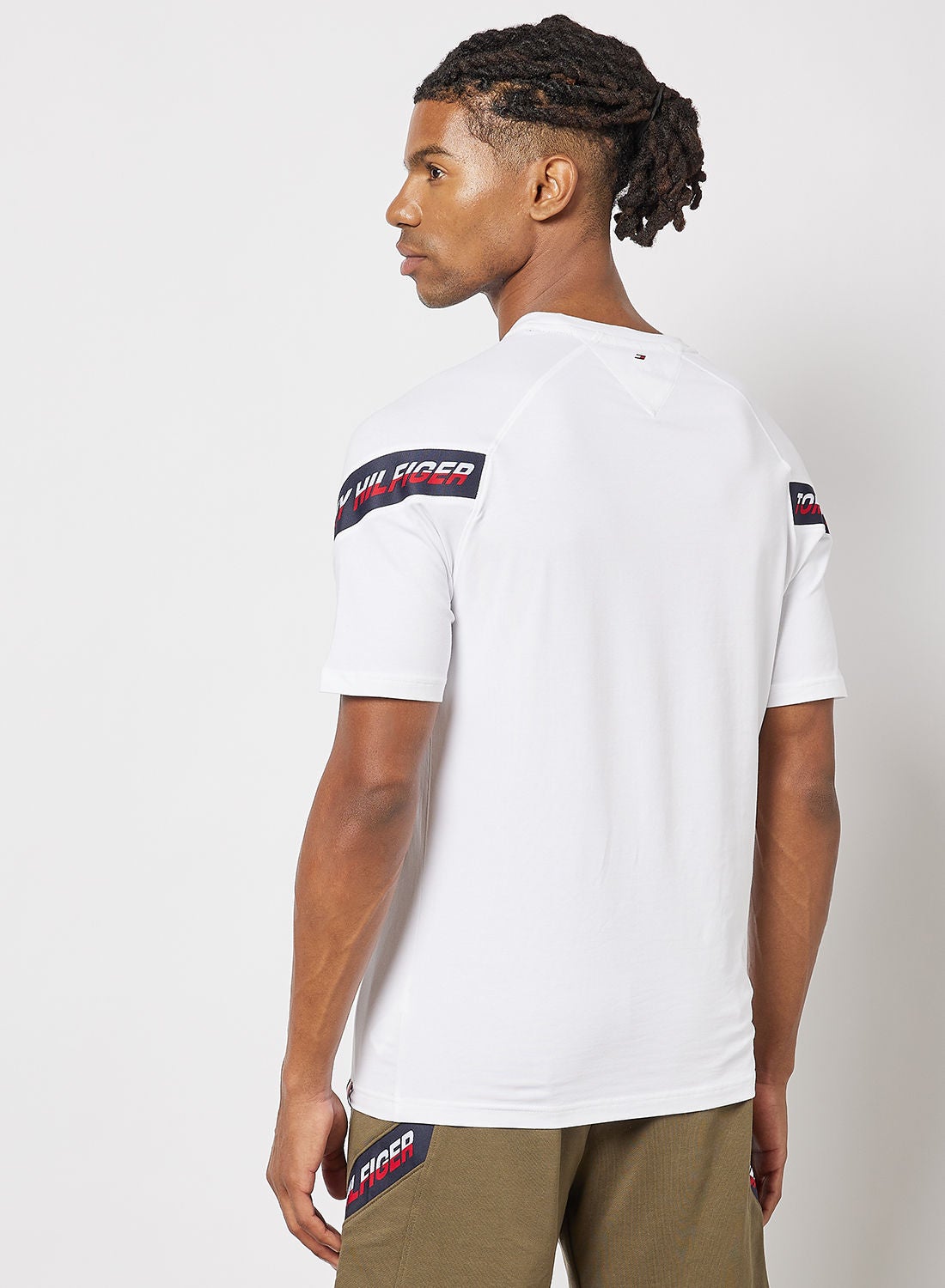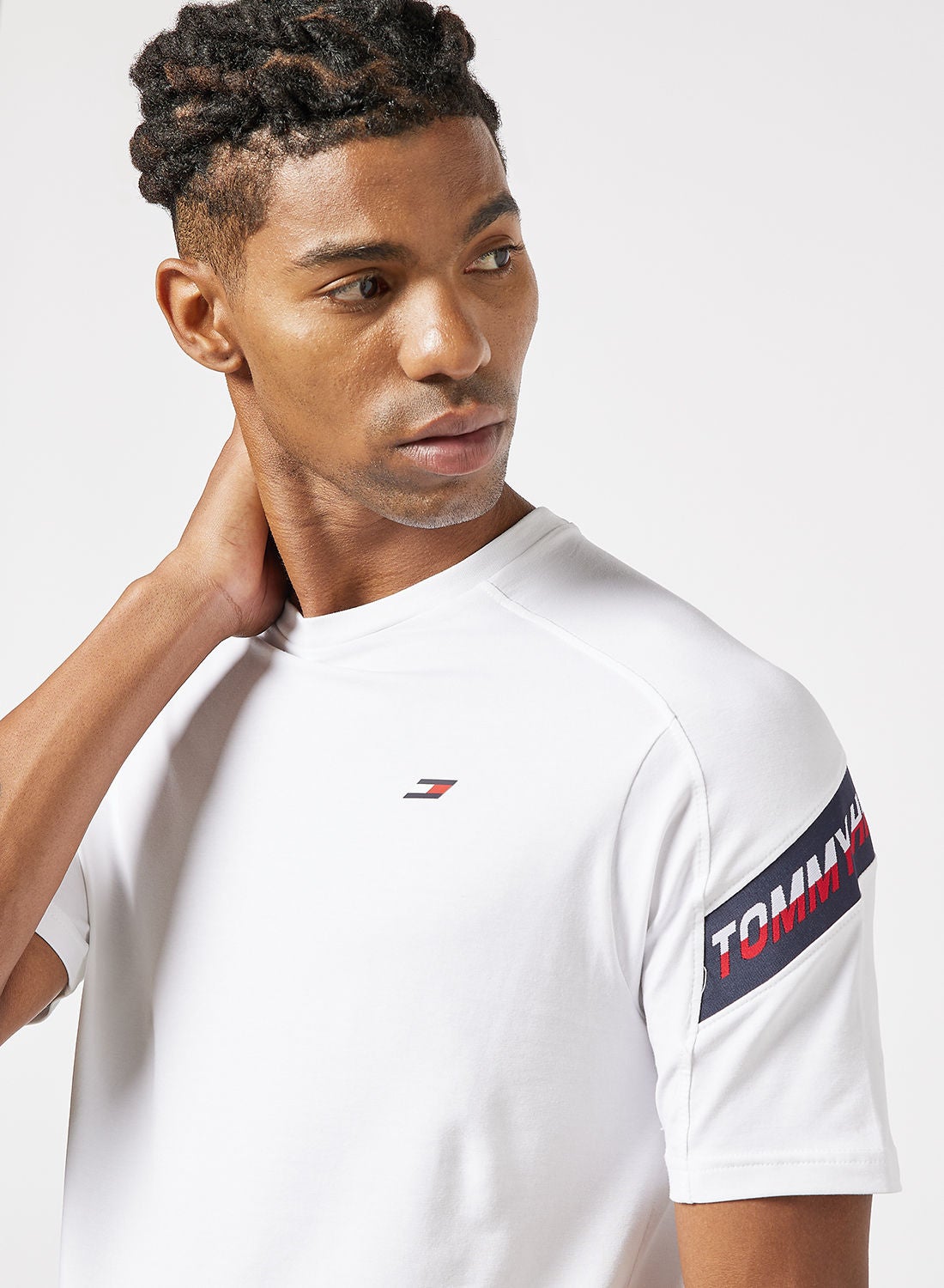 This product features a cotton blend fabric that is both soft and lightweight. It also includes cooling technology that ensures your comfort during warm weather. The design includes a crew neckline and short sleeves, and it is recommended to follow the care label instructions when washing. The product is branded with the signature Tommy Sport logo, and it is modeled by someone who is approximately 188cm tall and wears a size M.