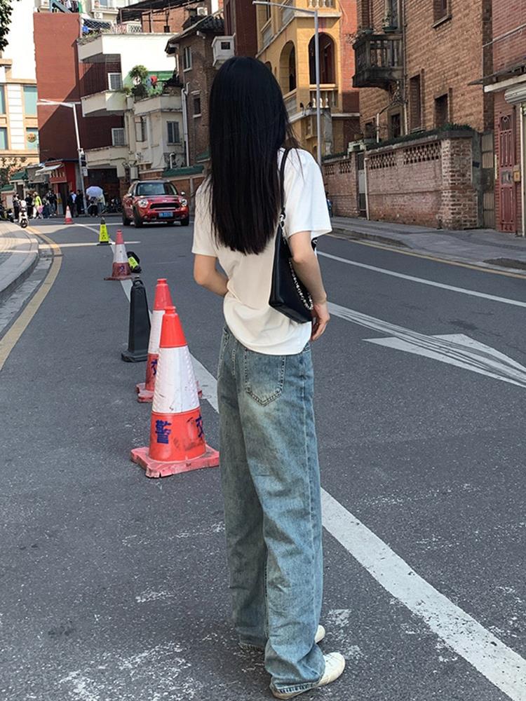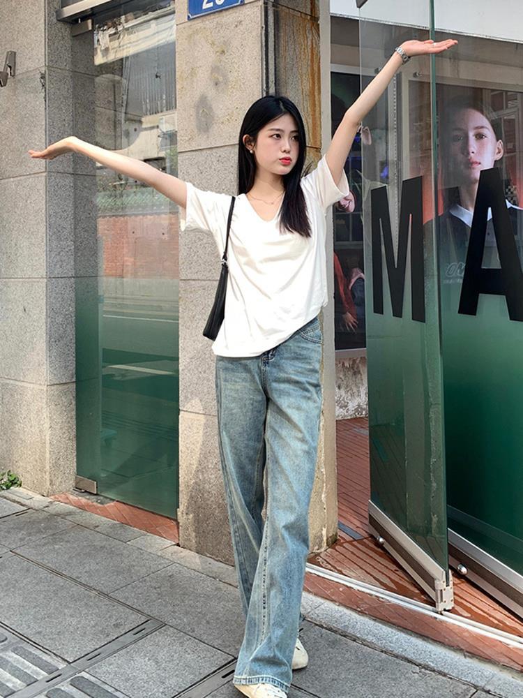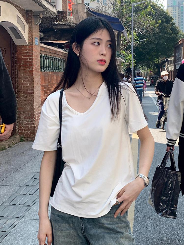 T White V-neck Shoulder Short-sleeved T-shirt Women's Summer 2024 New Loose Solid Color Base Shirt Inner Spice Top