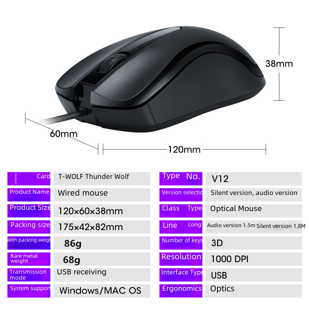 | nameOriginal | T-wolf Thunderwolf V12 Wired Mouse Laptop Desktop Computer USB Business Office Silent Extension Cable Mute |