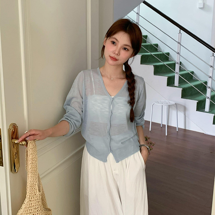 | nameOriginal | Table Blue Summer Thin Sunscreen Ice Silk Knitted Cardigan Korean Style Elegant All-match Long-sleeved Blouse Jacket for Women |