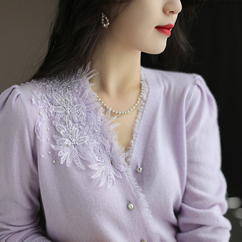 Tail single outside single French discount lace stitching knitted cardigan long sleeve v-neck base sweater