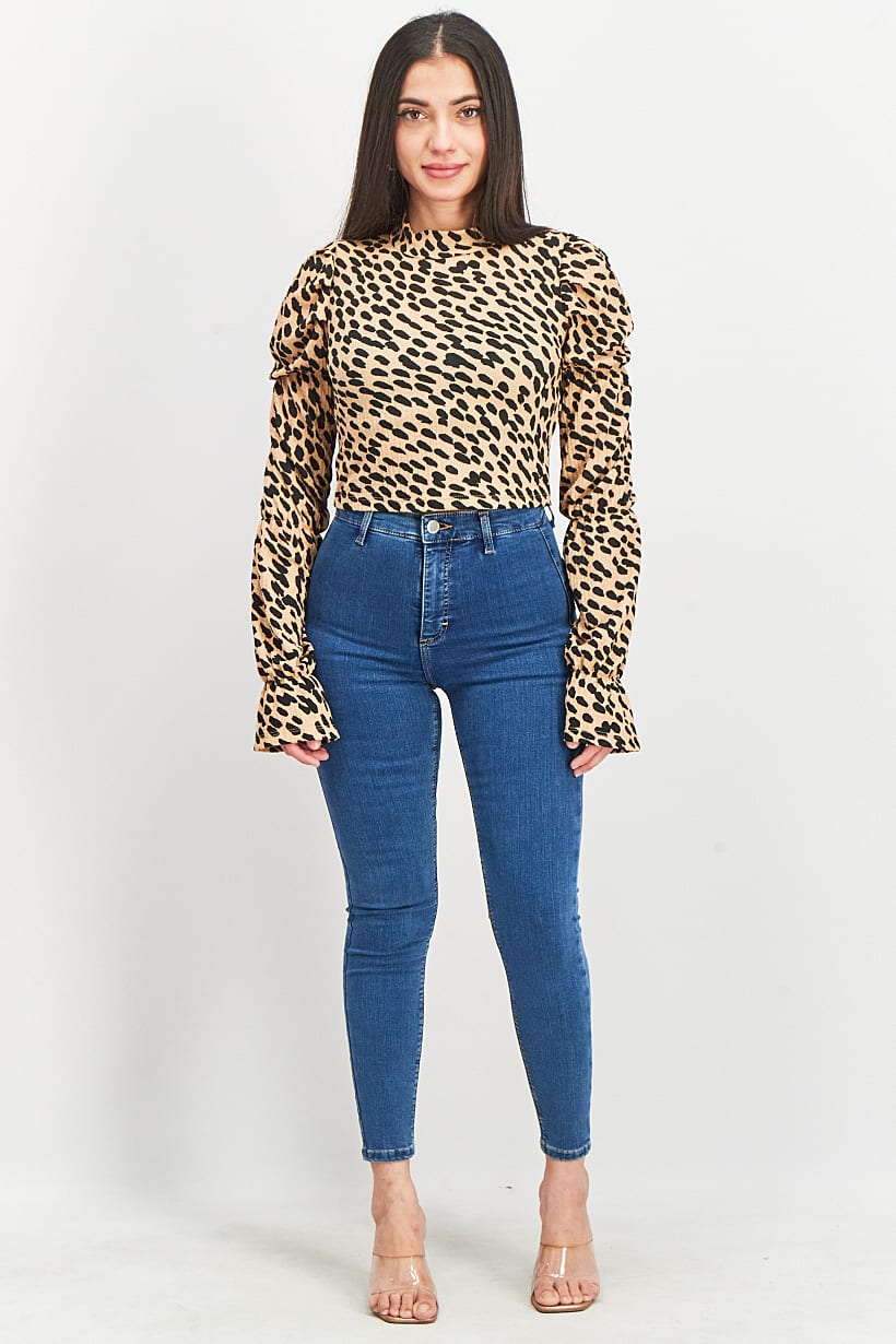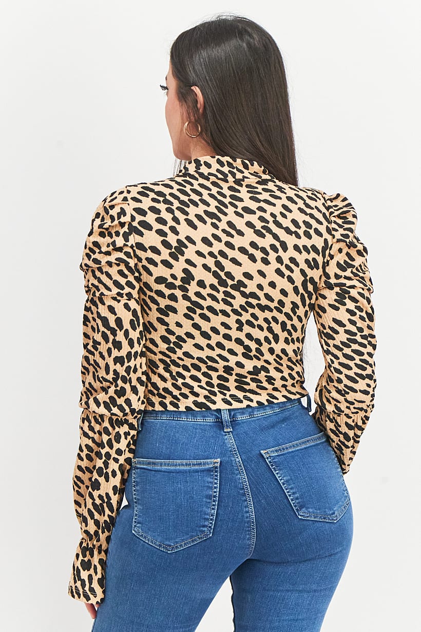 | sub_Categories | Women Clothing, Tops & Tees, women mock neck long sleeve allover print crop top tan black |