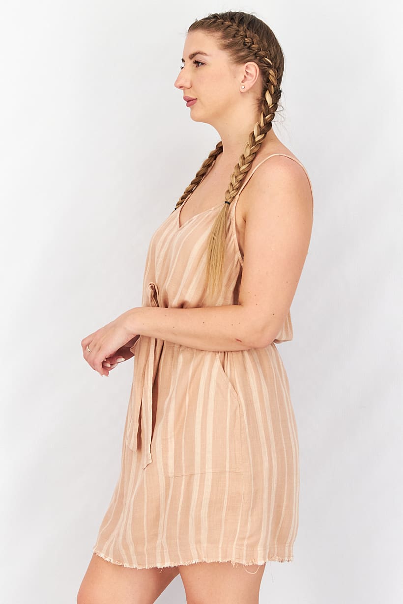 | nameOriginal | Women V Neck Sleeveless Stripe Belted Mini Dress, Tan |
