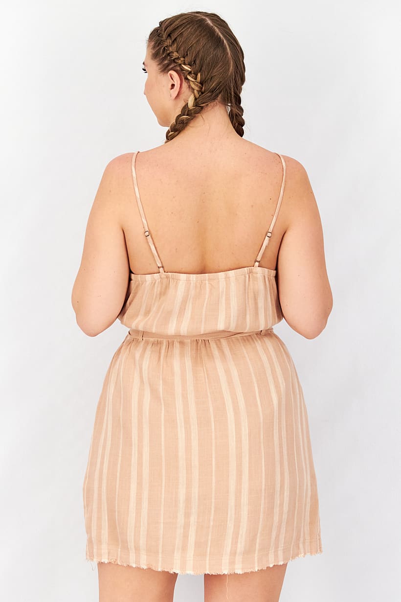 | descriptionOriginal | Care : Machine washable, Dress Style : Mini, Fit : Regular fit, Size shown : International, Types of Hem : Fringe hem, Types of Neckline & Collar : V-neckline, Types of Sleeve : Sleeveless, Disclaimer : Product color may slightly vary due to photographic lighting sources or your monitor settings., Fabrics : 75% Viscose, 25% Linen, Occasion : Casual, Pattern & Print : Stripe, Types of Closures : Pullover, Color Family : Tan, |