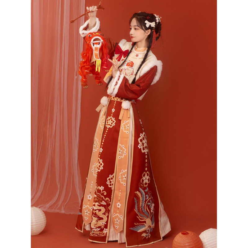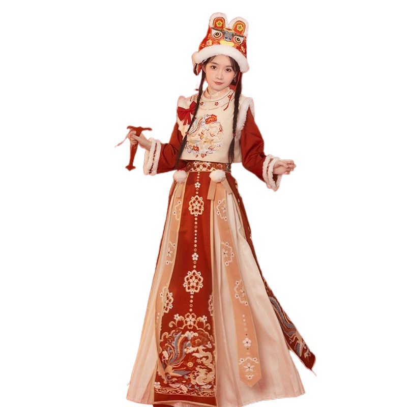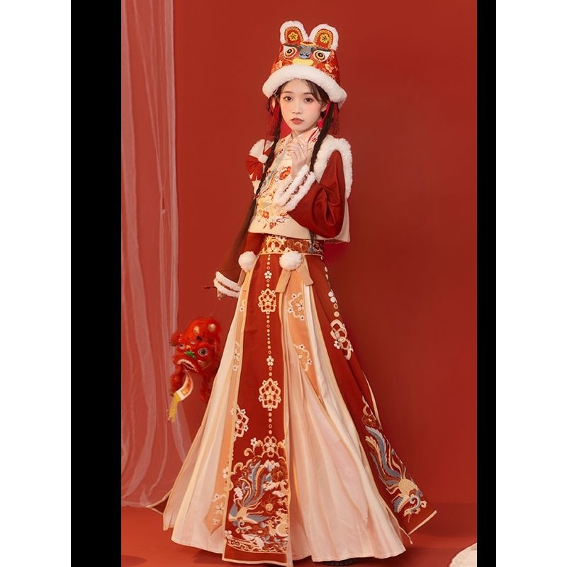 | nameOriginal | Tang hanfu women's fleece-lined thickened round neck one-piece pleated skirt improved Han element embroidered New Year suit winter |