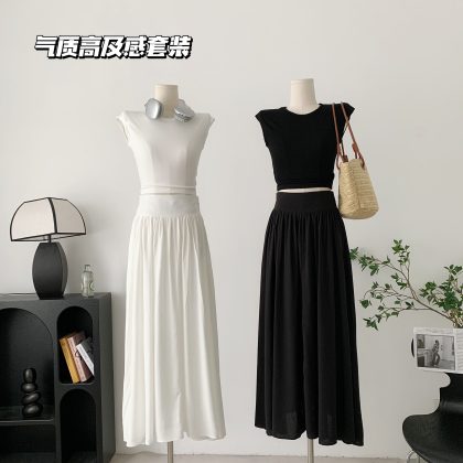 | nameOriginal | Taozi homemade super good-fitting tops slimming round neck short waist-revealing black and white solid color T-shirt for women |