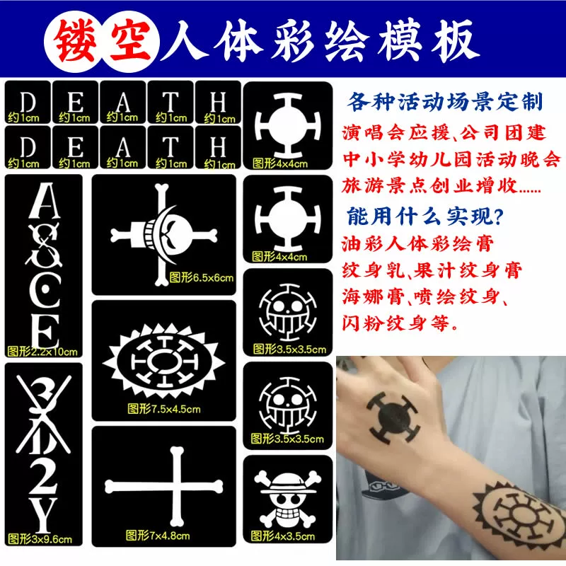 | nameOriginal | Tattoo hollow template One Piece Trafalgar Law cartoon simulation semi-permanent tattoo sticker juice paste |