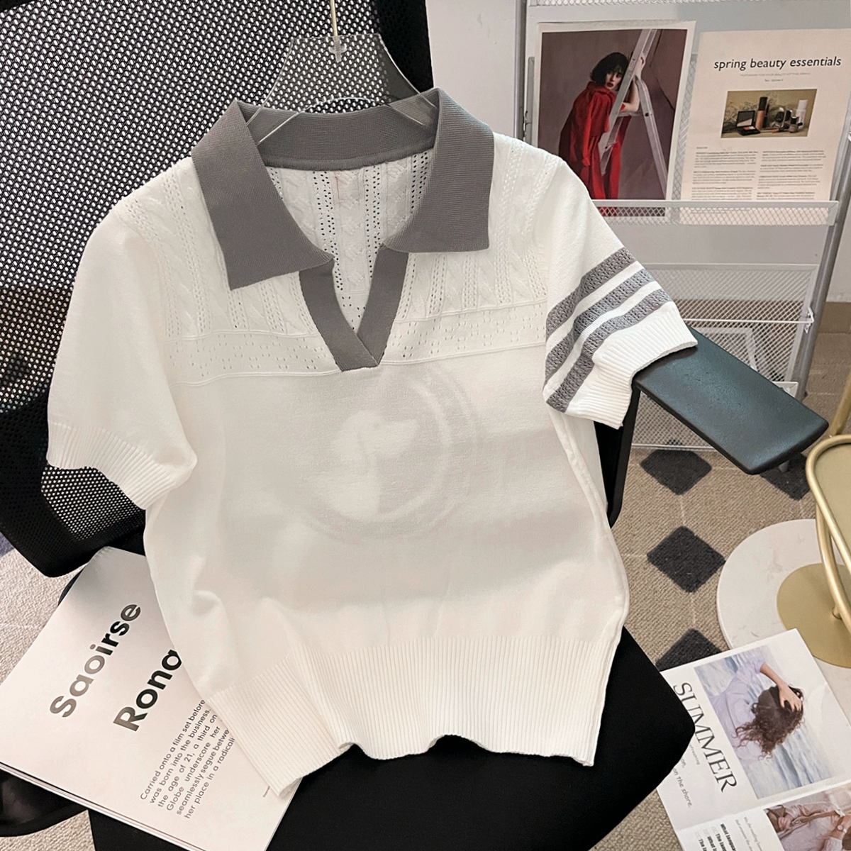 Short-sleeved T-shirt polo shirt thin back medal puppy jacquard half-open collar knitted top for women 2025 summer new