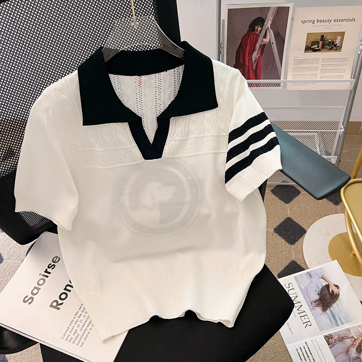 TB short-sleeved T-shirt polo shirt thin back medal puppy jacquard half open collar knitted top for women 2024 summer