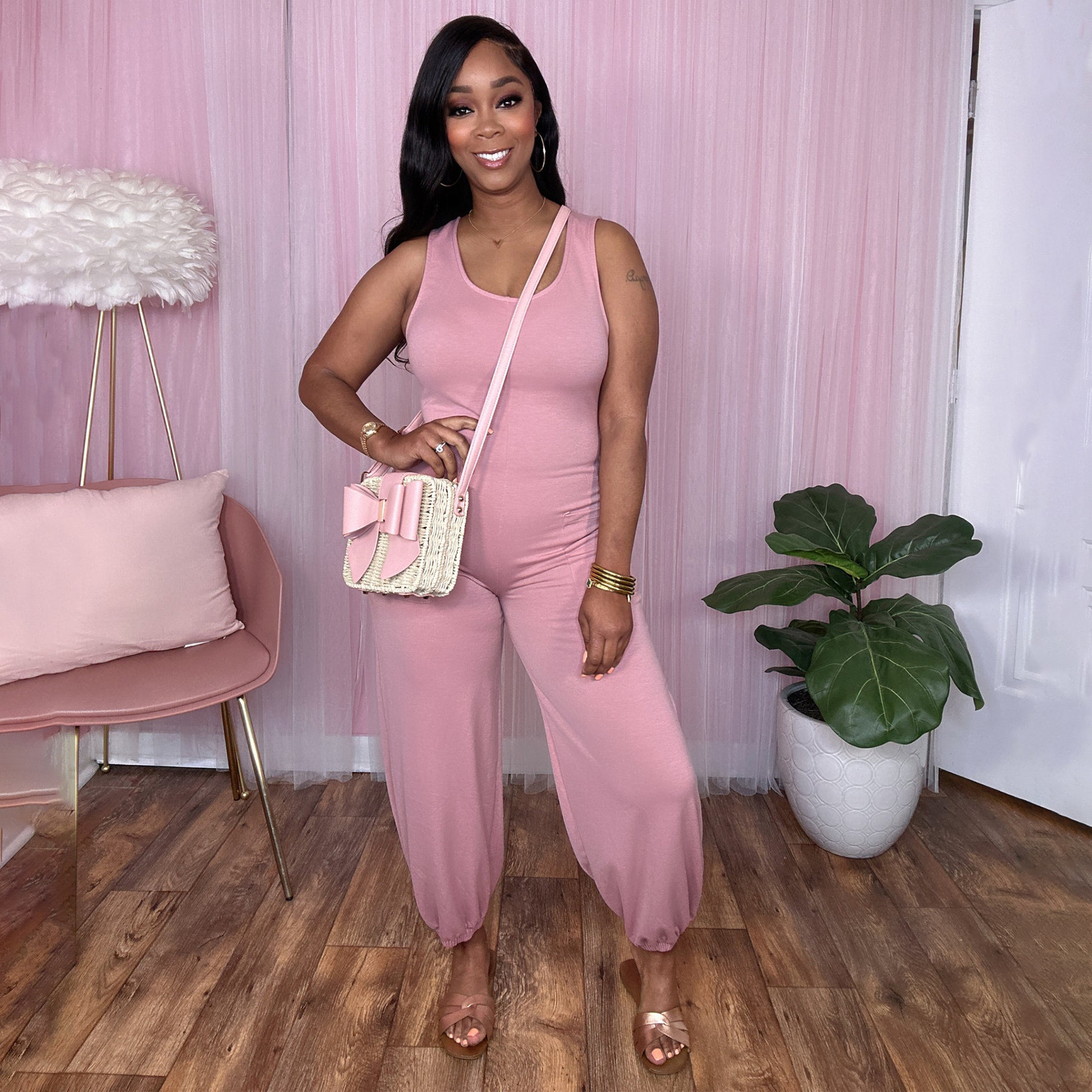 | nameOriginal | TD2314 European and American solid color U-collar sleeveless shoulder strap loose casual jumpsuit cross-border for new AliExpress |