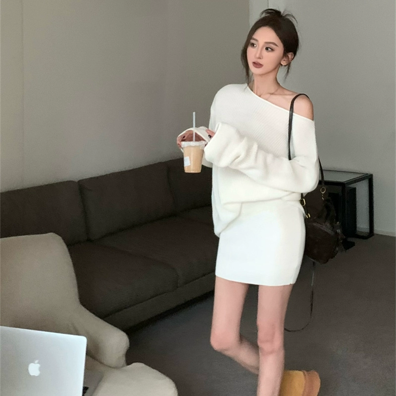 Tea style one shoulder knitted hip skirt long sleeve sweater