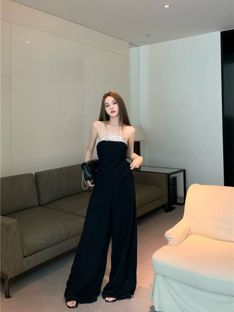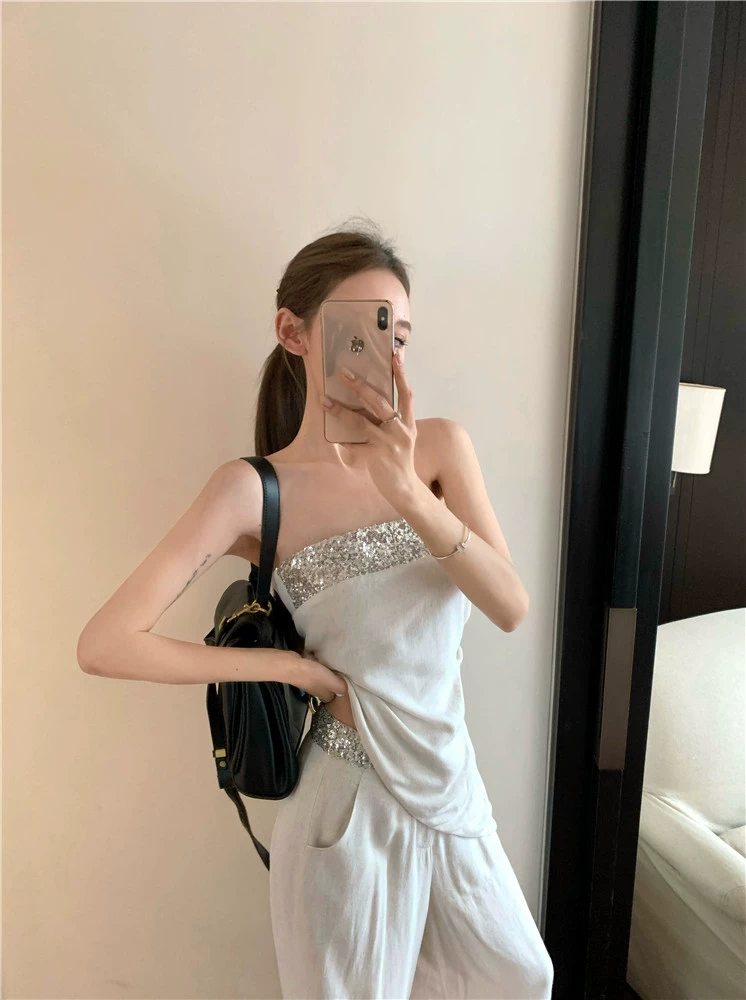 | nameOriginal | Tea style tube top casual pants beige two piece sequin set |