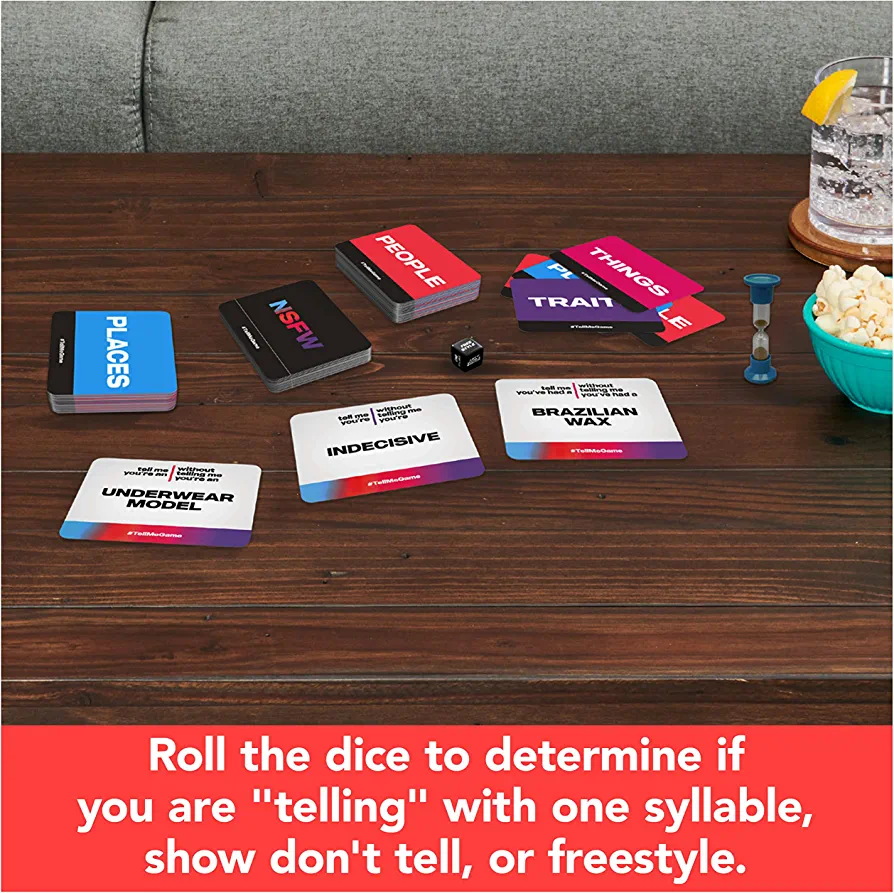 The Tell Me Game by Spin Master Games is the perfect addition to any party, whether it’s a college dorm gathering, happy hour, or bachelorette party. It’s a fun-filled activity that will have everyone laughing, acting, and speaking, and maybe even rapping. The game is played in teams, with each team taking turns to roll the die and start their turn by flipping the timer. The objective is to give hints to your team to guess as many cards as possible within the given time, without breaking the die’s rule. The die has three categories: Show Don’t Tell, One Syllable, and Freestyle, each with its unique set of rules. The card categories include People, Traits, Things, Places, and NSFW. The game is suitable for teens and adults aged 18 and above, and we advise playing with family and coworkers at your own risk. The game is sure to have your friends in fits of laughter with its risqué cards. It also makes a great stocking stuffer, party favor, or housewarming gift. Get your favorite people together and play the Tell Me Game for a night of endless fun.