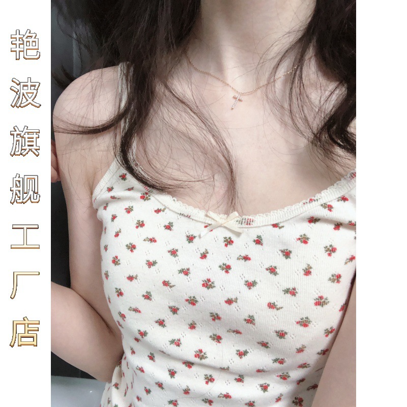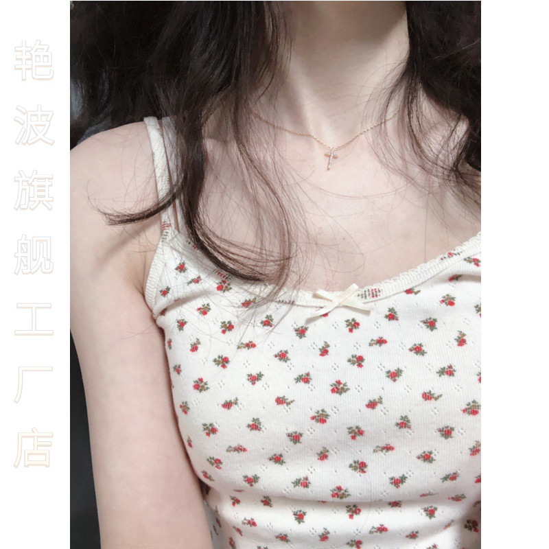 | nameOriginal | Temperament Brandy Red Floral Small Sling Women's Spring Lace Bow Bm Vest Short Taste Top |
