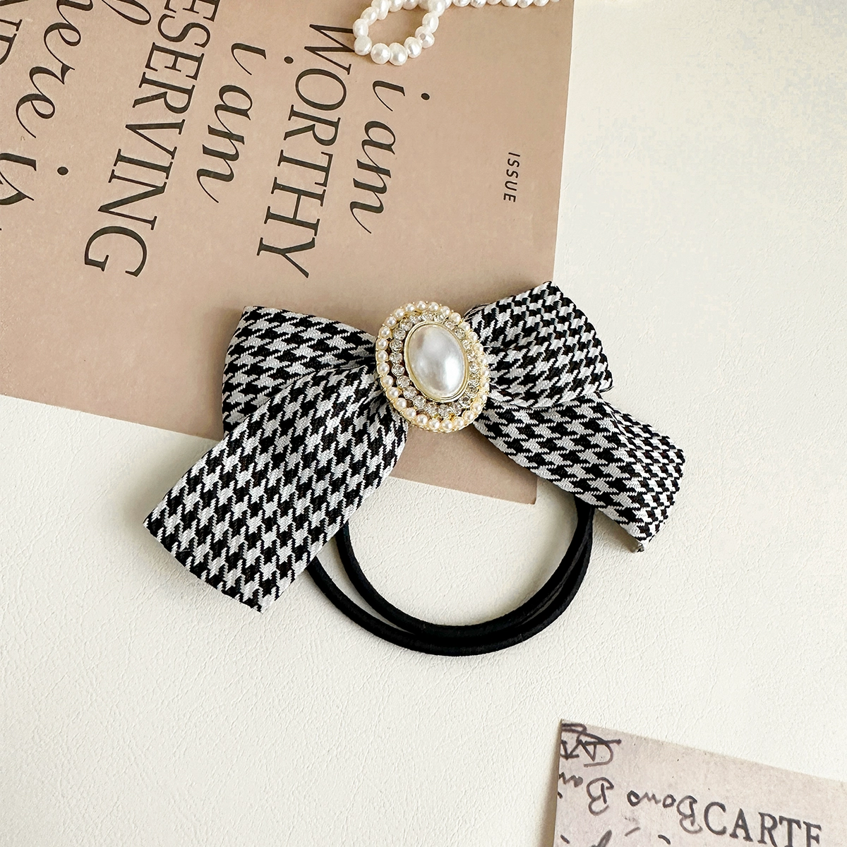 | nameOriginal | Temperament houndstooth hair rope for women, high-end pearl retro French bow hair accessory, gentle and elegant 2022 new style |