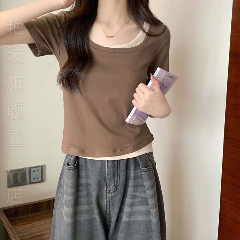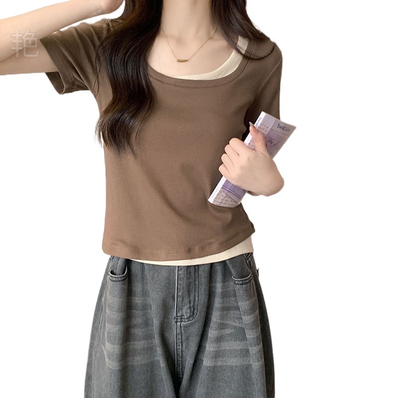 | nameOriginal | Temperament Korean style color contrast fake two piece stitching short sleeve T-shirt women 2024 summer square collar slim slim taste |