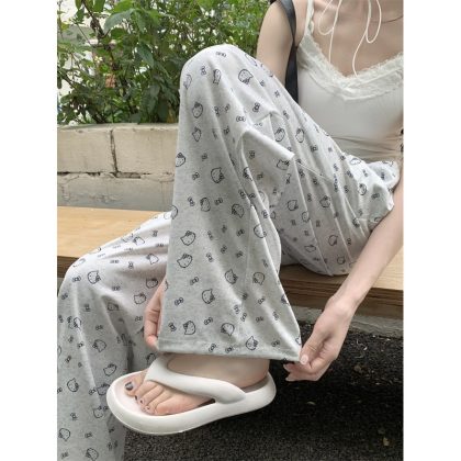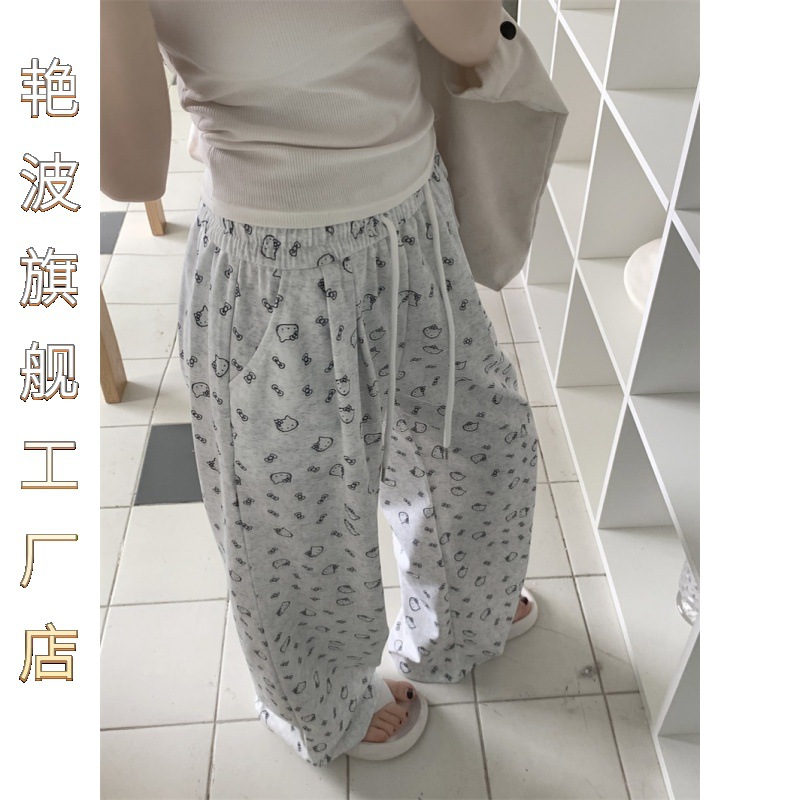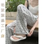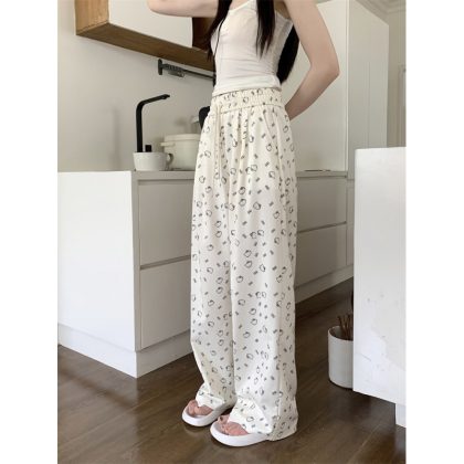 Temperament Korean style printed drawstring elastic waist casual pants women’s 2024 summer new straight tube walking wide leg tasteful