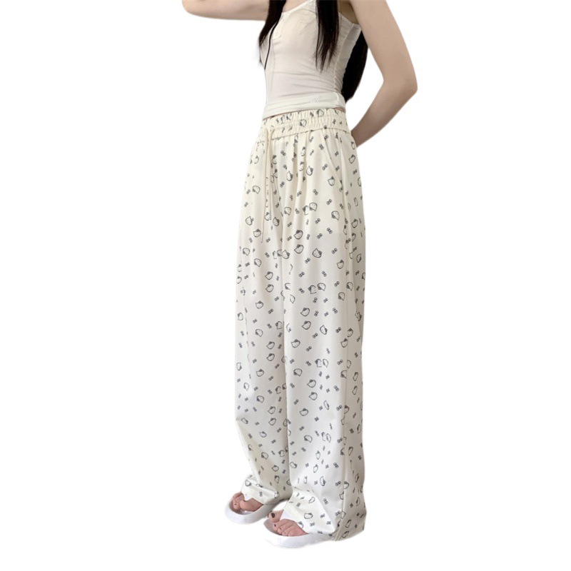 Temperament Korean style printed drawstring elastic waist casual pants women's 2024 summer new straight tube walking wide leg tasteful