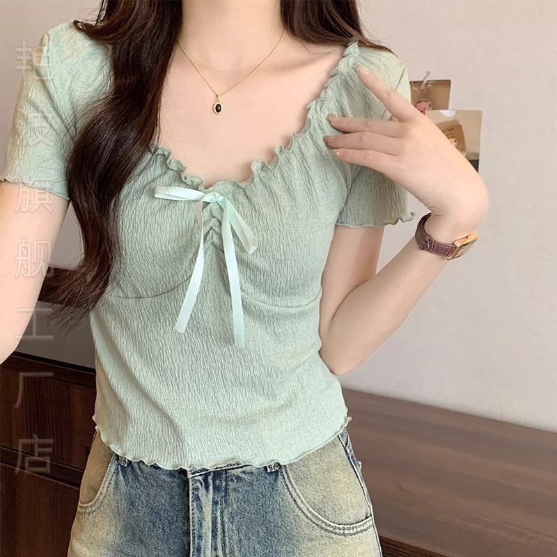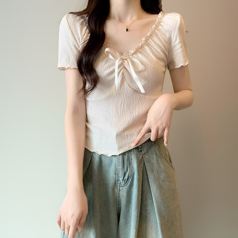 Temperament Milk apricot Ballet Style Wear V-neck Short-sleeved T-shirt Women's Summer Ear Edge Lace Bow Short Taste