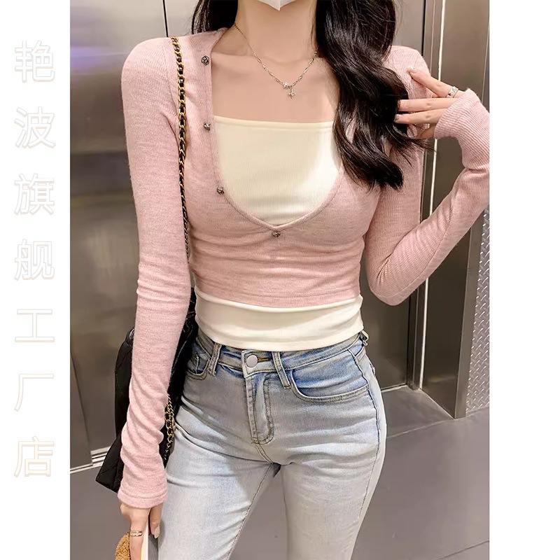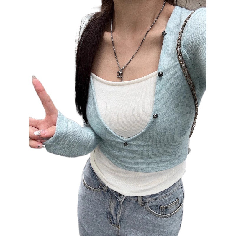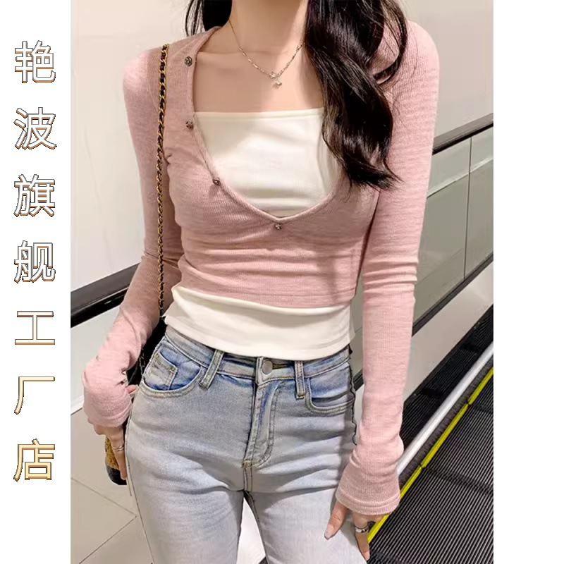 | nameOriginal | Temperament Niche Design Sense Spice Girl Fake Two-piece Long-sleeved T-shirt Women's Chic Spring Dress Square Collar Collarbone Tight and Taste |