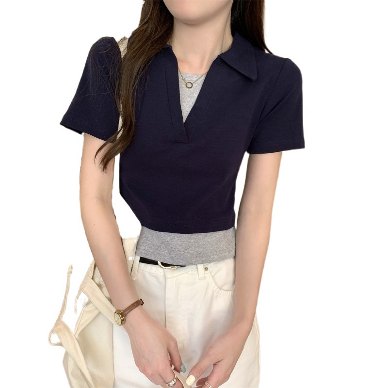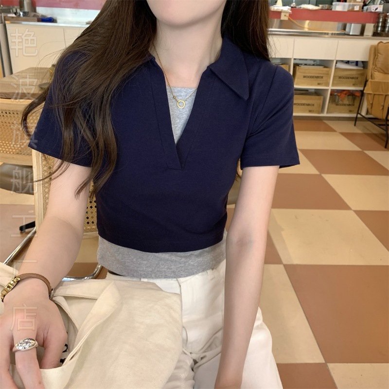 | nameOriginal | Temperament polo collar contrast color stitching fake two T-shirt short sleeve female summer design sweet hot girl high waist short taste |