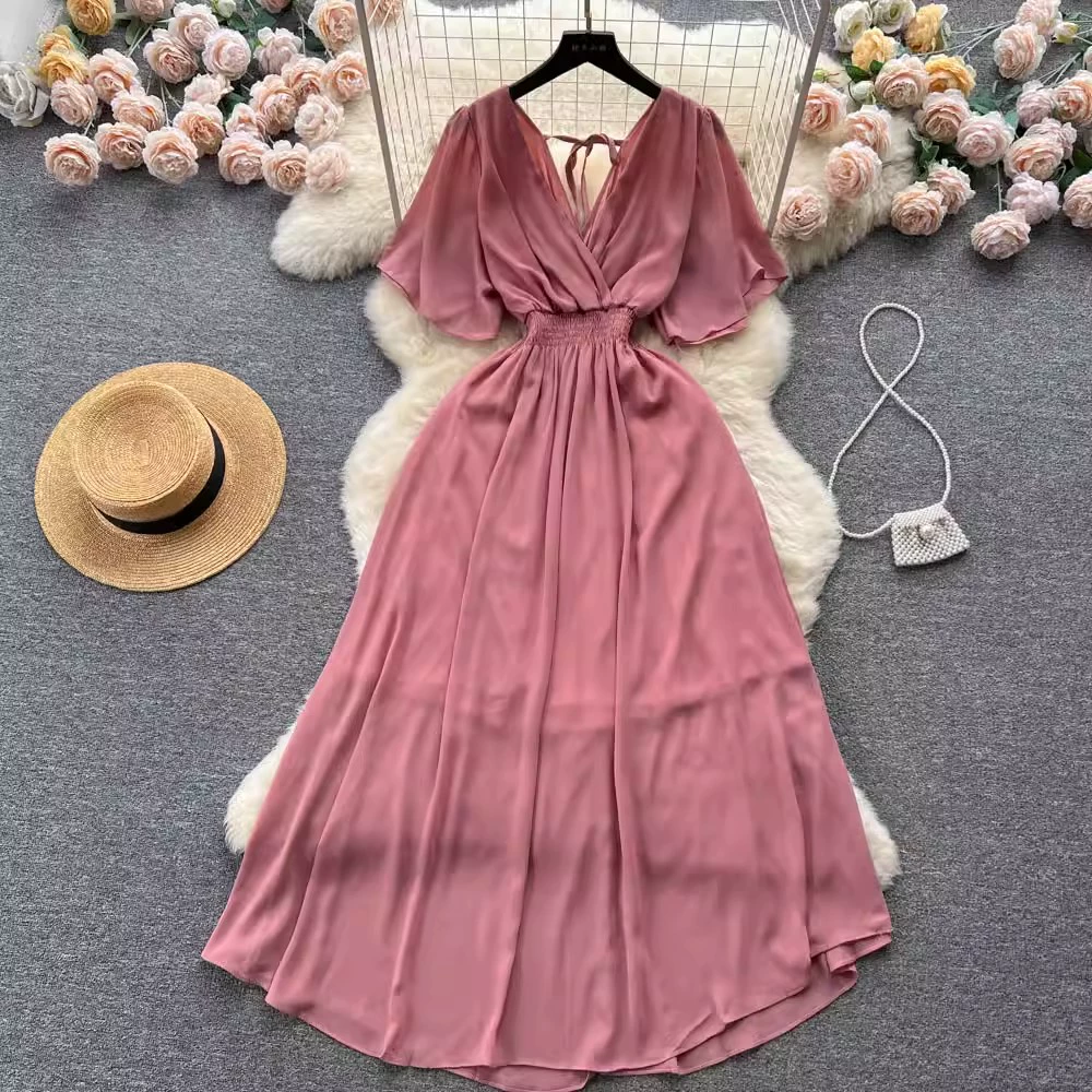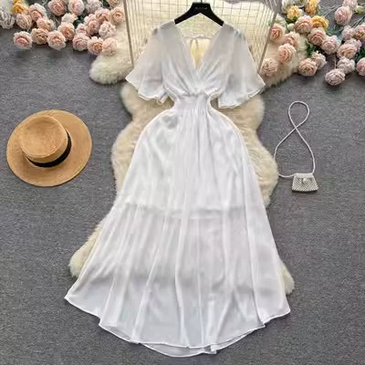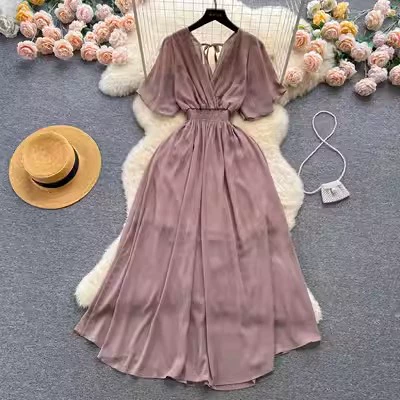 | nameOriginal | Temperament V-neck stretch long beach chiffon dress |