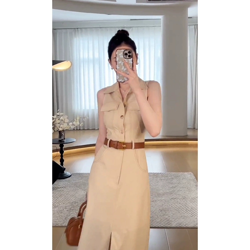 | nameOriginal | Temperamental Sleeveless Lapel Dress Women's Imitation Denim Waist Slit Slimming Long Skirt 2024 Summer New Women's Clothing |