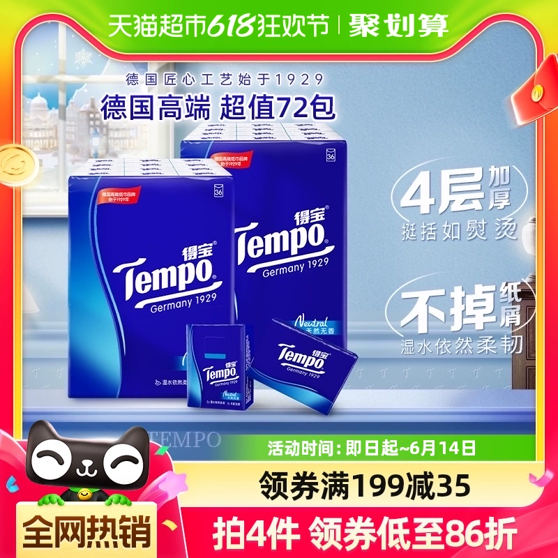 | nameOriginal | Tempo Depot handkerchief paper classic unscented 4-layer thickened portable napkins affordable 7 sheets * 72 pack new and old alternating |