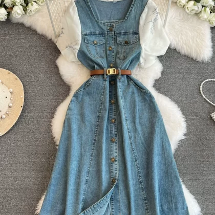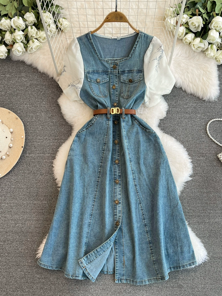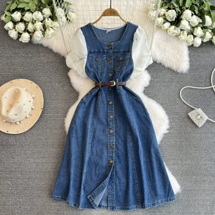 | nameOriginal | Tencel denim dress summer 2024 new style spliced puff sleeve waist mid-length over the knee plus size skirt |