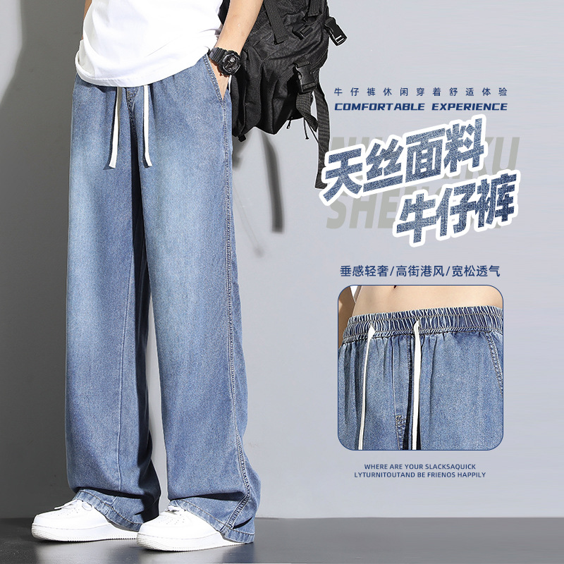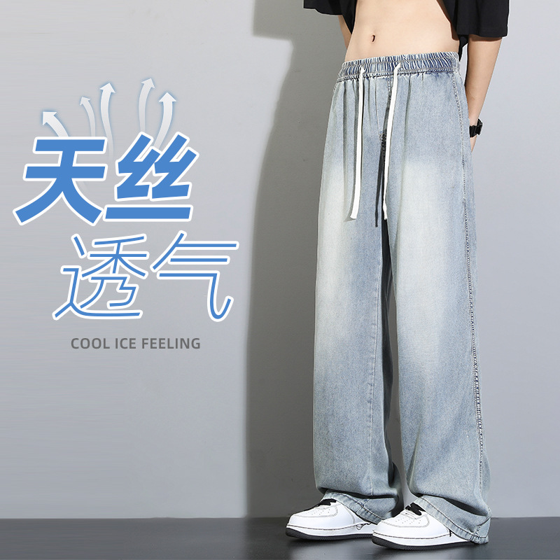 Tencel Retro Jeans Men's 2024 Summer Thin Wide Leg Straight Pants Students American-style High Street Loose
