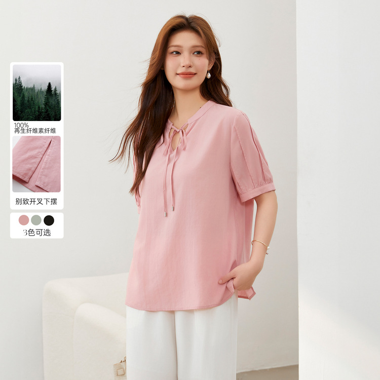 Tencel Shirt Slim Show plus size Women's Breathable V-neck Lace-up Simple Split Top Chubby mm2024 Summer New