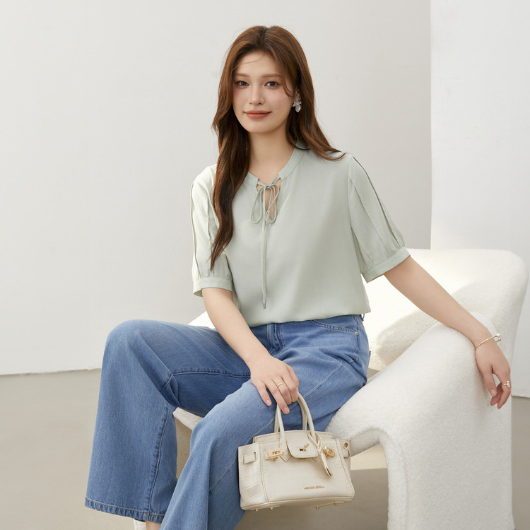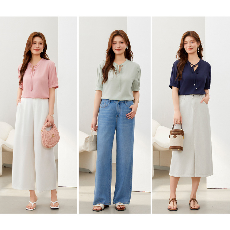 Tencel Shirt Slim Show plus size Women’s Breathable V-neck Lace-up Simple Split Top Chubby mm2024 Summer New