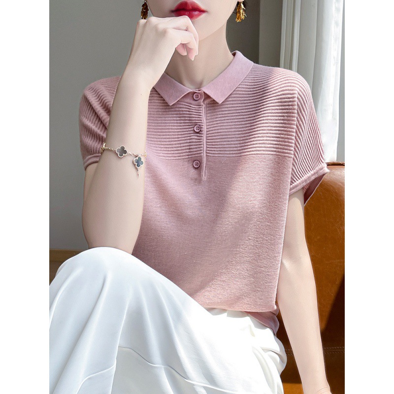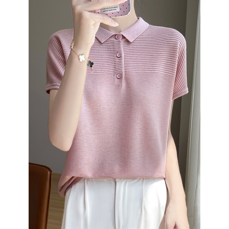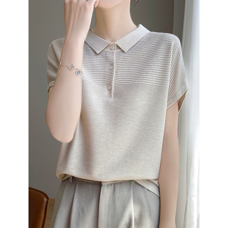 Tencel Short-sleeved Women’s Doll Collar French Thin Solid Color Loose Knitted Top POLO Lar Button High-grade T-shirt